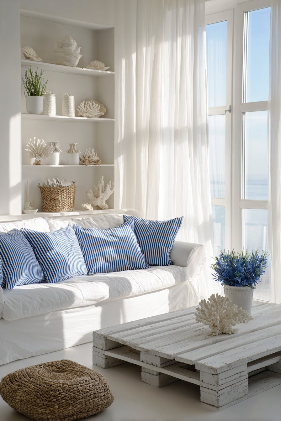 Key Design Tips: Use white slipcovers for classic coastal appeal and easy washing; incorporate navy and white stripes for timeless nautical pattern; Choose whitewashed or driftwood-finish furniture for beach house character; add natural fiber elements like jute, sisal, and seagrass; display beach findings and coral sparingly to avoid kitsch; maximize natural light with sheer white window treatments; keep the palette predominantly white and blue with natural accents; create a relaxed, lived-in look rather than formal arrangements; bring in ocean-inspired colors like aqua, seafoam, and sand; focus on creating a breezy, carefree atmosphere.