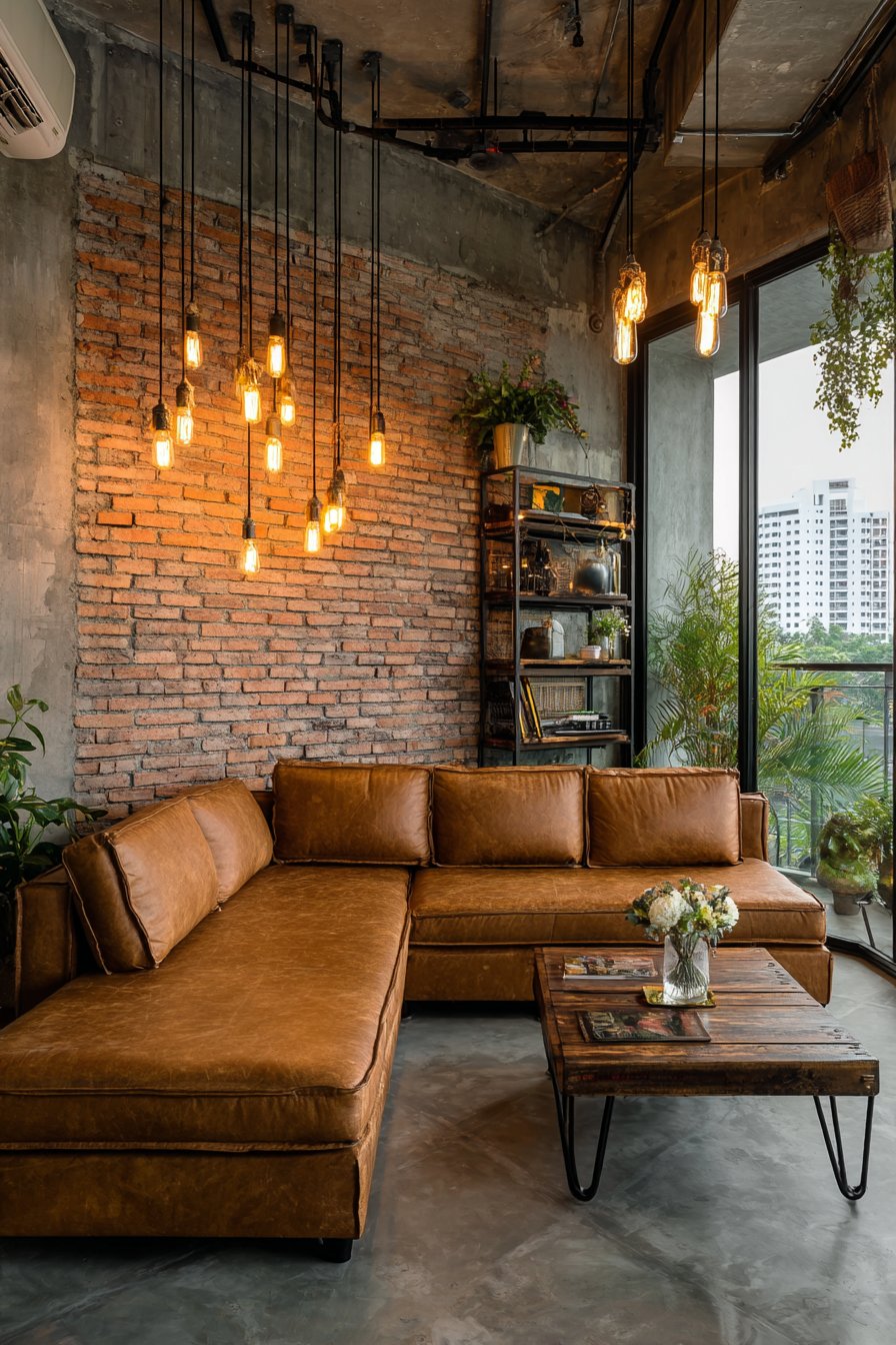 Edison bulb pendant lights hang at varying heights from black cord, their visible filaments and warm amber glow creating ambiance while celebrating the beauty of exposed mechanics—a hallmark of industrial style. A vintage metal bookshelf, perhaps salvaged from an old factory or library, displays books, potted plants, and meaningful objects, its utilitarian construction and honest materials fitting perfectly with the industrial theme. Natural daylight from tall windows combines with warm artificial lighting in photography that balances the masculine industrial elements with genuine residential comfort, proving that this style works beautifully in apartment settings.