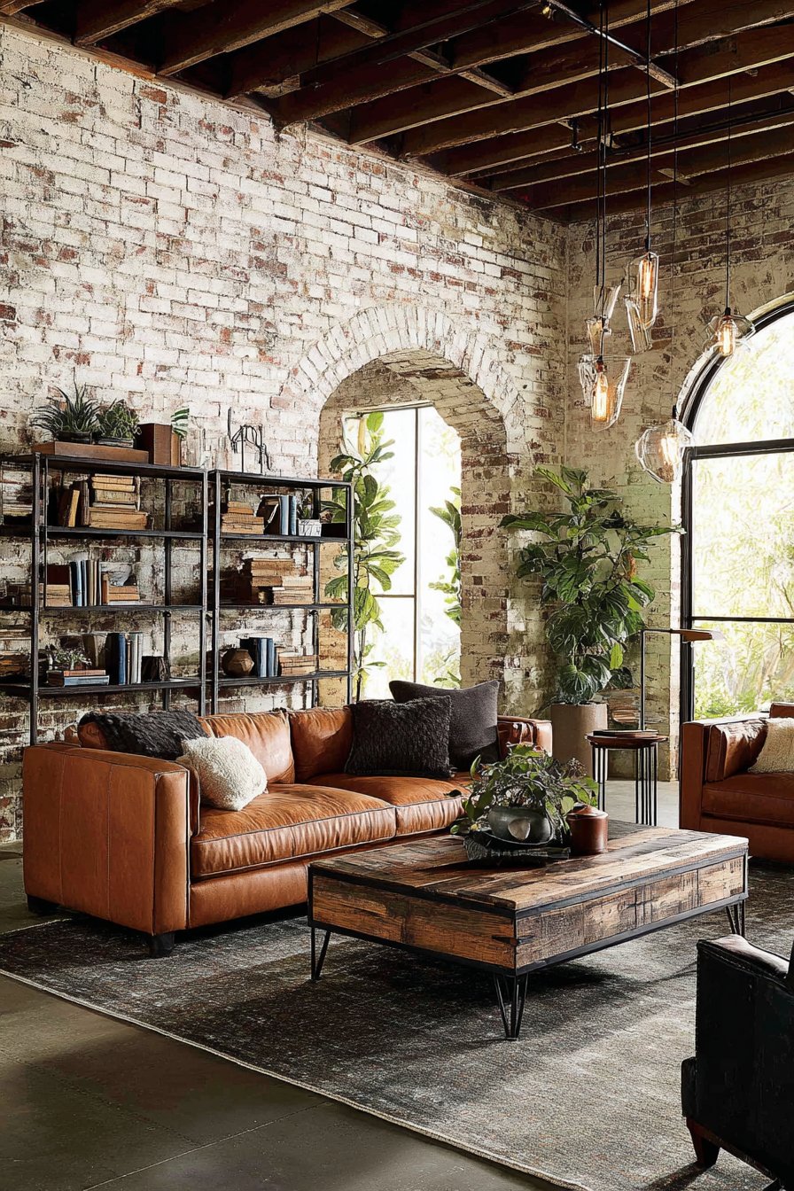 Key Design Tips: Balance industrial hardness with warm materials like leather and wood; use reclaimed wood for character and sustainability; incorporate exposed brick (real or veneer) for textural interest; hang Edison bulb lighting for industrial authenticity and warm glow; Choose metal furniture and shelving in black or gunmetal finishes; allow patina and wear to develop naturally on materials; mix vintage industrial pieces with modern comfort; maintain high ceilings or create vertical space with tall shelving; use cognac or warm brown leather for inviting warmth; celebrate honest materials and visible construction; keep the palette in warm neutrals, blacks, and natural wood tones.