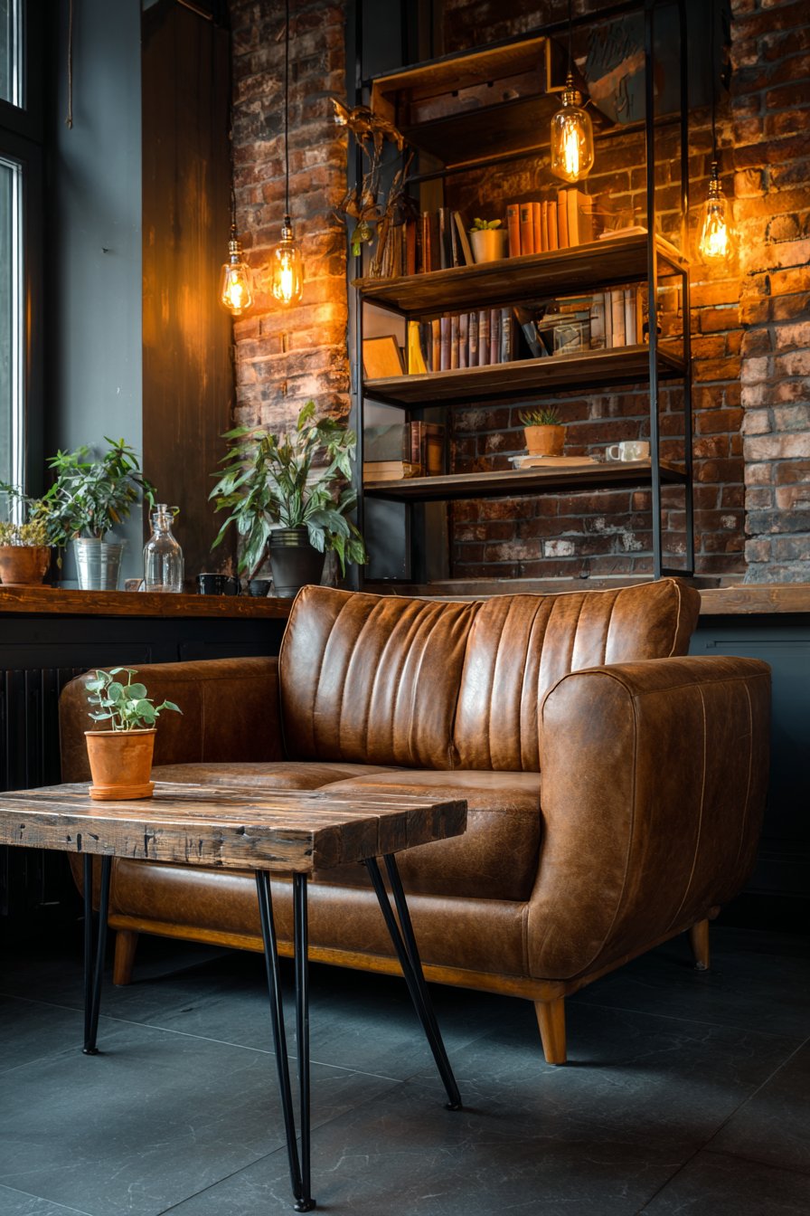 A reclaimed wood coffee table on black metal hairpin legs perfectly embodies industrial-chic style—the weathered wood showing its history through variations in tone, knots, and grain while the sleek metal legs provide structural honesty characteristic of industrial design. Against one wall, exposed brick (whether original architecture or applied brick veneer) provides textural backdrop and authentic urban character, its warm red tones complementing the leather and wood beautifully.