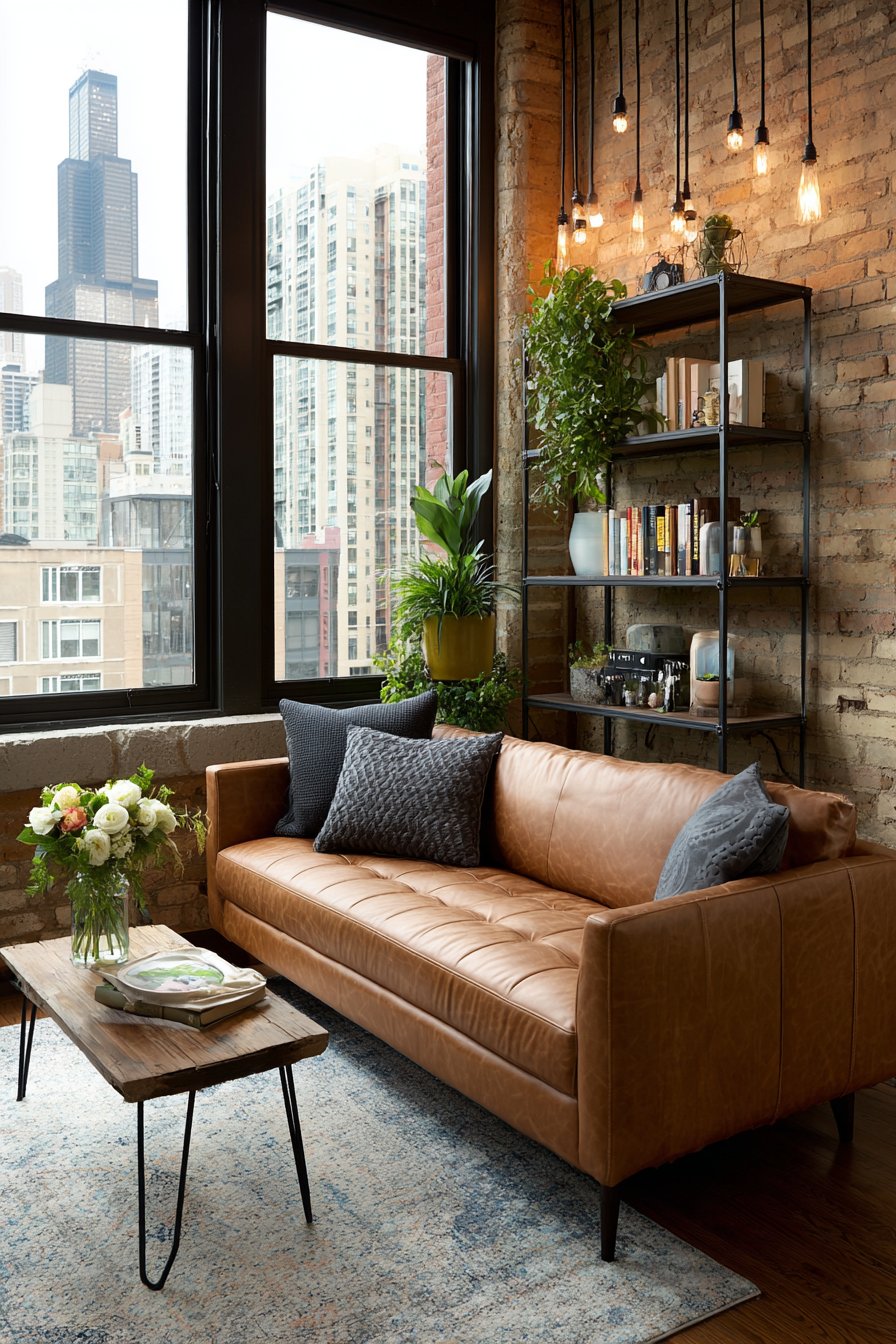 This edgy living room demonstrates how industrial design elements can create surprisingly cozy apartment spaces when balanced with warm materials and thoughtful styling. The compact leather sofa in rich cognac brown provides both visual warmth and durable seating that actually improves with age, developing a beautiful patina that adds character over time. Its clean lines and quality leather upholstery elevate the industrial aesthetic beyond cold warehouse vibes into something genuinely livable and sophisticated.