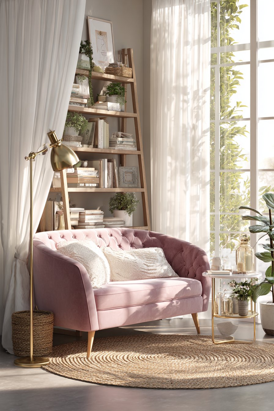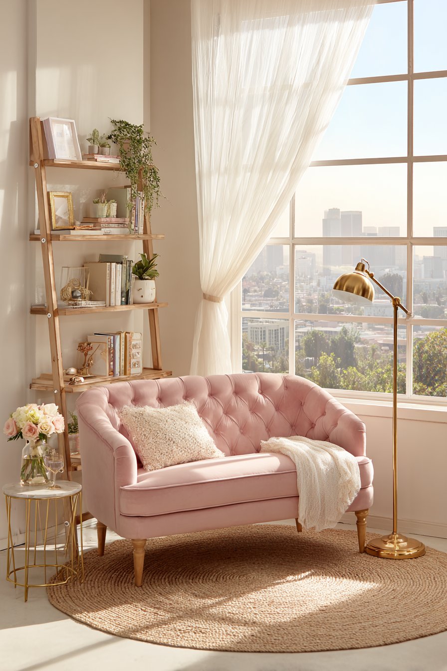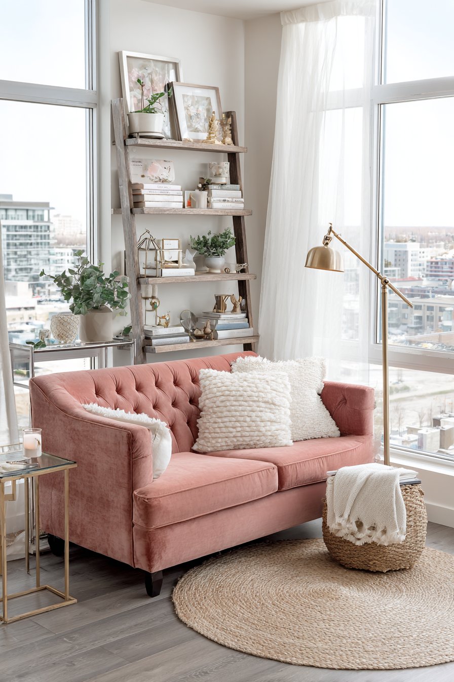 This enchanting living room design centers on a small-scale tufted loveseat upholstered in the most gorgeous dusty rose velvet, a piece that immediately establishes the room’s romantic and feminine character. The velvet’s subtle sheen catches light beautifully throughout the day, creating depth and visual interest while the button tufting adds classic elegance without feeling overly formal. Paired with a vintage-inspired brass floor lamp featuring an adjustable arm and fabric shade, the seating area becomes the perfect spot for evening reading or quiet contemplation.