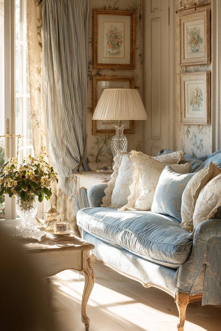 Key Design Tips: Embrace unexpected colors like lavender for romantic, memorable spaces; Use distressed furniture for shabby chic authenticity; add lace or crochet details for vintage femininity; Choose crystal or glass lamps for elegant lighting; create gallery walls with floral art in ornate frames; Install gauzy curtains that diffuse light beautifully; incorporate curved furniture legs for traditional elegance; layer soft textures throughout for romantic comfort; allow imperfections and worn patinas for authentic shabby chic; focus on creating dreamy, feminine atmospheres; use soft pastels and whites as your color foundation.