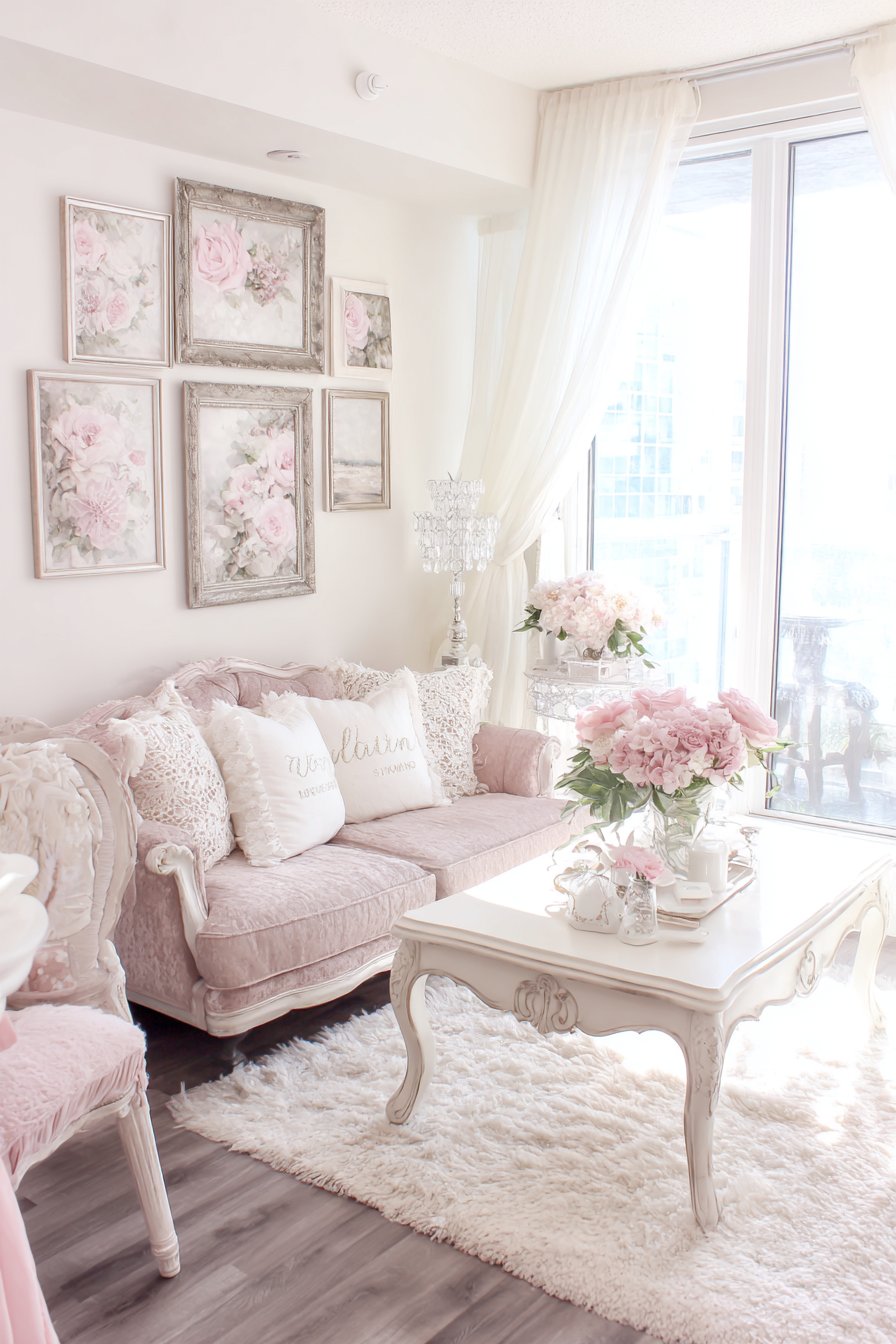 Floral watercolor prints in ornate gold or cream frames create a gallery wall that reinforces the romantic, vintage theme—imagine soft roses, peonies, and wildflowers painted in gentle pastels that echo the lavender sofa. Wide-angle interior photography with golden hour lighting streaming through gauzy curtains captures the dreamy, feminine aesthetic perfect for compact living, showcasing how layers of soft textures, gentle colors, and vintage details create spaces that feel like stepping into a beautiful daydream.