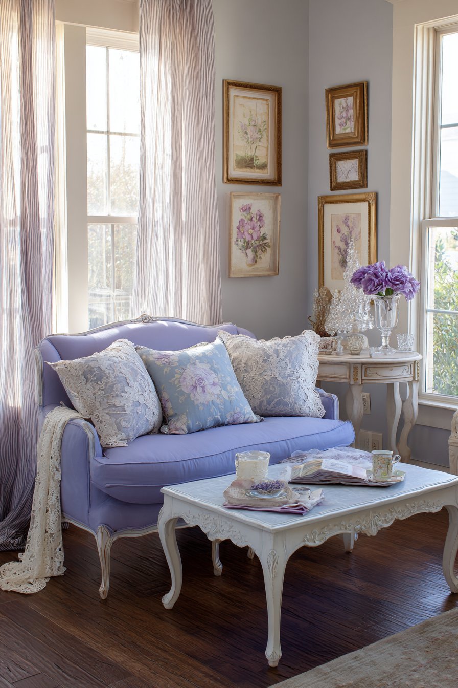 This dreamy living room creates a romantic sanctuary through soft colors, vintage-inspired furniture, and delicate details that transport you to a French countryside cottage. The small-scale rolled-arm sofa in soft lavender fabric makes an immediate impression, its gentle purple hue both unexpected and utterly charming. The rolled arms add traditional elegance while lace-trimmed throw pillows introduce vintage femininity and handcrafted charm that makes the space feel personal and collected.