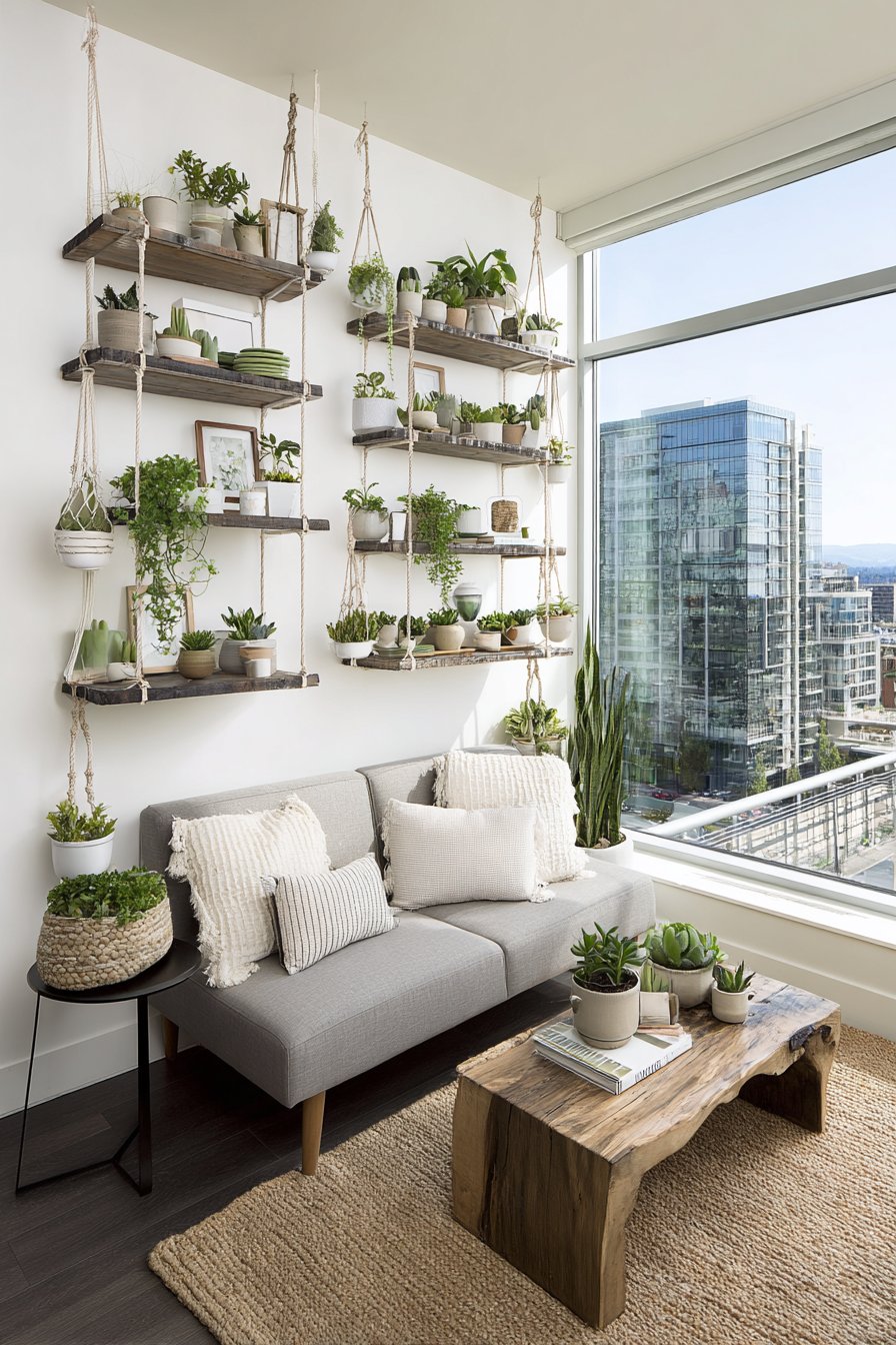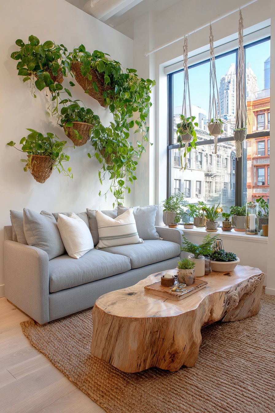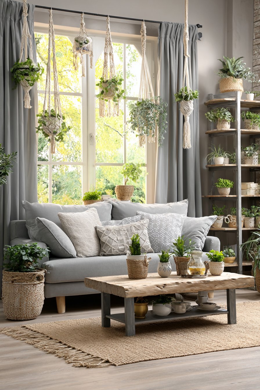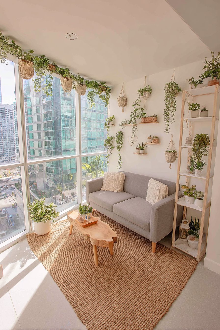 This verdant living room celebrates biophilic design by surrounding inhabitants with abundant greenery that purifies air, reduces stress, and connects urban apartment dwellers with nature. The simple grey loveseat provides neutral backdrop for the real stars of this space—an impressive collection of potted plants displayed on tiered plant stands that maximize vertical growing space, wall-mounted planters that create living art installations, and hanging macramé holders suspending trailing varieties at varying heights throughout the room.