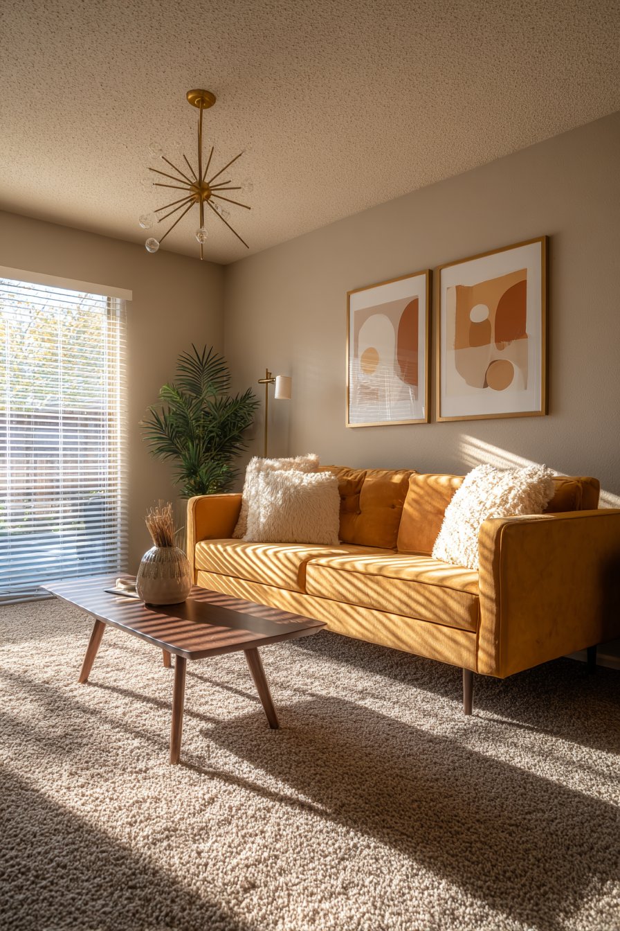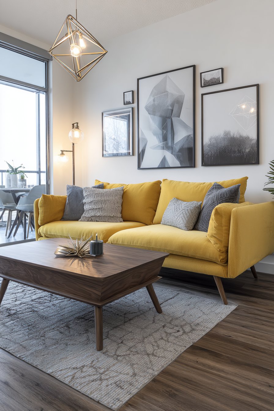 This stylish living room channels the optimism and clean lines of mid-century modern design through iconic furniture forms and period-appropriate colors. The low-profile sofa with tapered wooden legs in cheerful mustard yellow fabric immediately establishes the era and mood—this golden-yellow hue was ubiquitous in 1950s and 60s interiors and feels both retro and remarkably current. The tapered legs, often in walnut or teak tones, provide the signature silhouette that defines mid-century furniture.