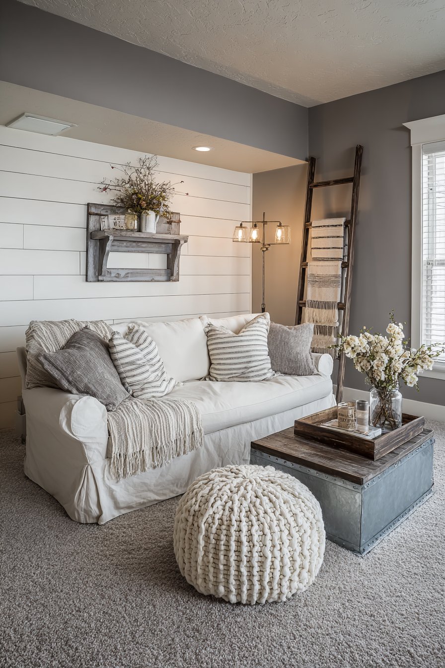 Key Design Tips: Use natural linen slipcovers for farmhouse softness and practicality; Incorporate distressed wood furniture for rustic character; add galvanized metal accents for industrial farmhouse appeal; Install shiplap (real or peel-and-stick) for architectural interest; display blankets on vintage ladders for decorative storage; Use mason jars as vases for humble charm; keep color palettes in soft whites, greys, and natural woods; mix rustic and refined elements for modern farmhouse balance; choose practical, washable fabrics; celebrate imperfection and aged materials; focus on creating comfortable, lived-in spaces.