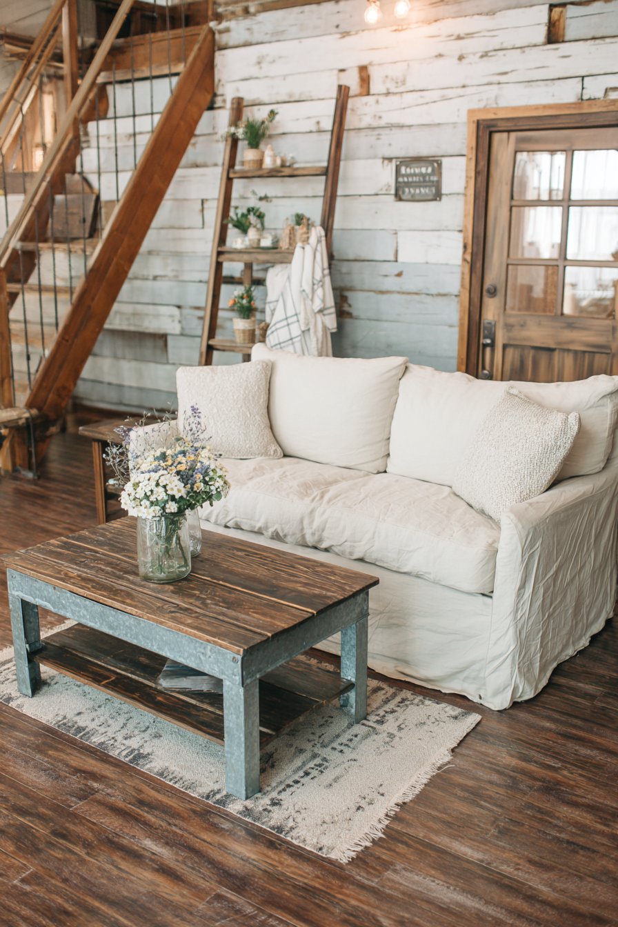 This charming living room blends the rustic warmth of farmhouse style with contemporary livability, creating spaces that feel collected and comfortable without sacrificing modern conveniences. The slipcovered sofa in natural linen provides the foundation—its washable cover practical for real life while its relaxed fit and natural fabric create that effortless, farmhouse aesthetic. The linen’s subtle texture and neutral color work beautifully with both rustic and refined elements.