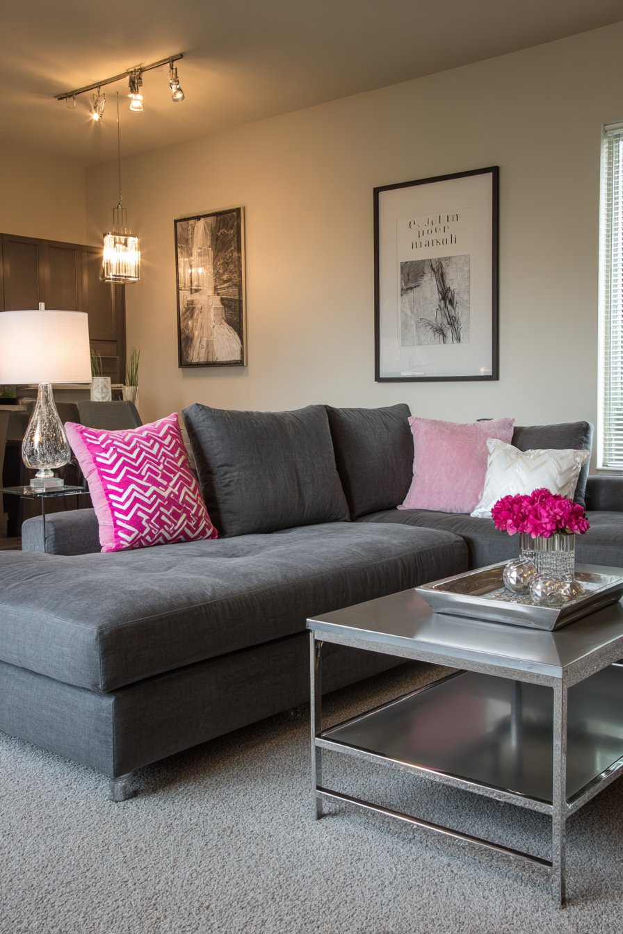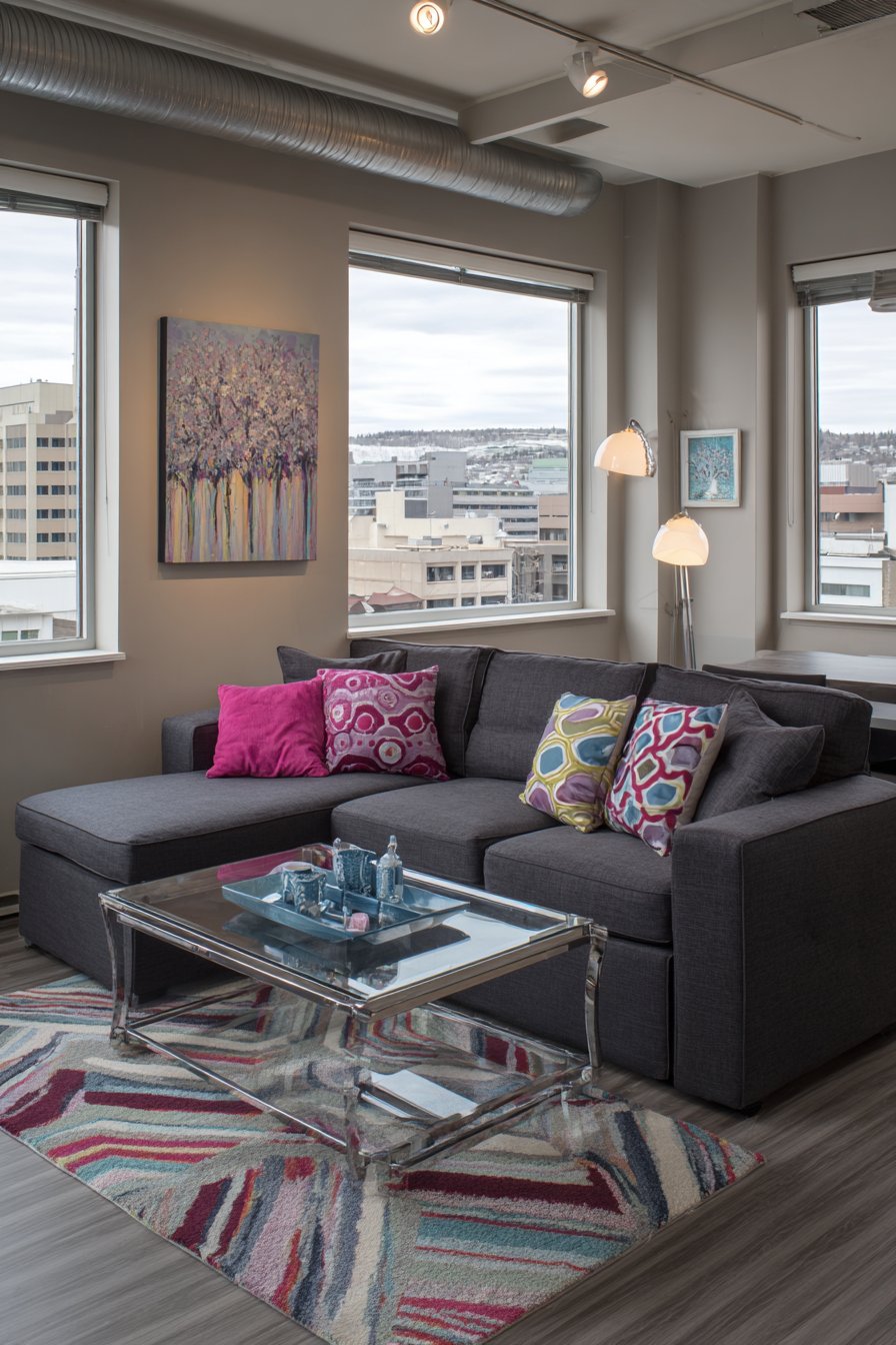 A sleek chrome and glass coffee table maintains the modern aesthetic through its transparent surface and reflective metal frame—nothing hidden, all structural elements exposed and celebrated for their honest beauty. Geometric throw pillows in bold colors—perhaps electric blue, vibrant coral, or sunny yellow—inject personality and visual interest while remaining easily changeable as your tastes evolve or seasons change. Track lighting installed on the ceiling illuminates artwork on the walls with focused beams, creating gallery-like presentation in your apartment.