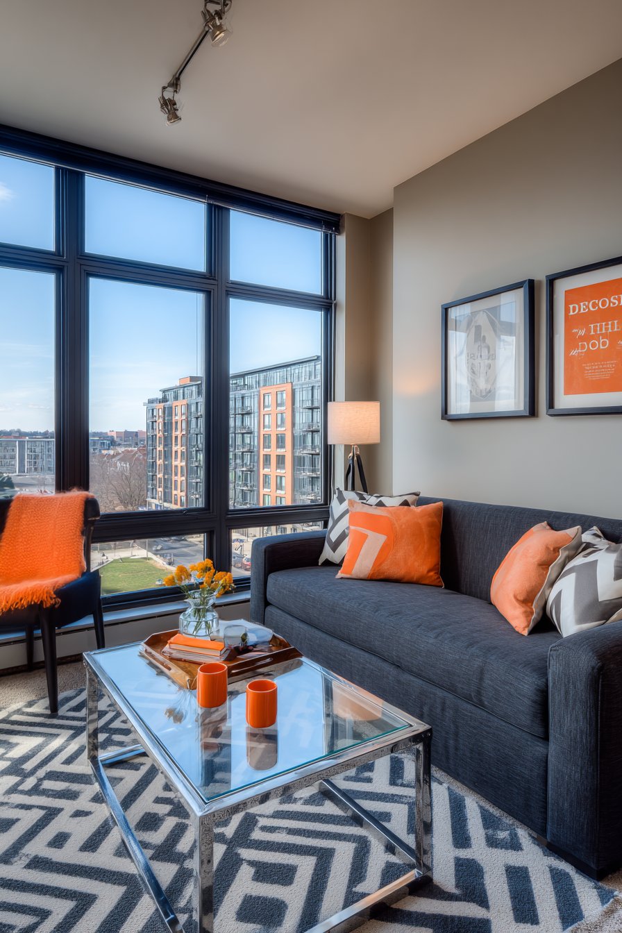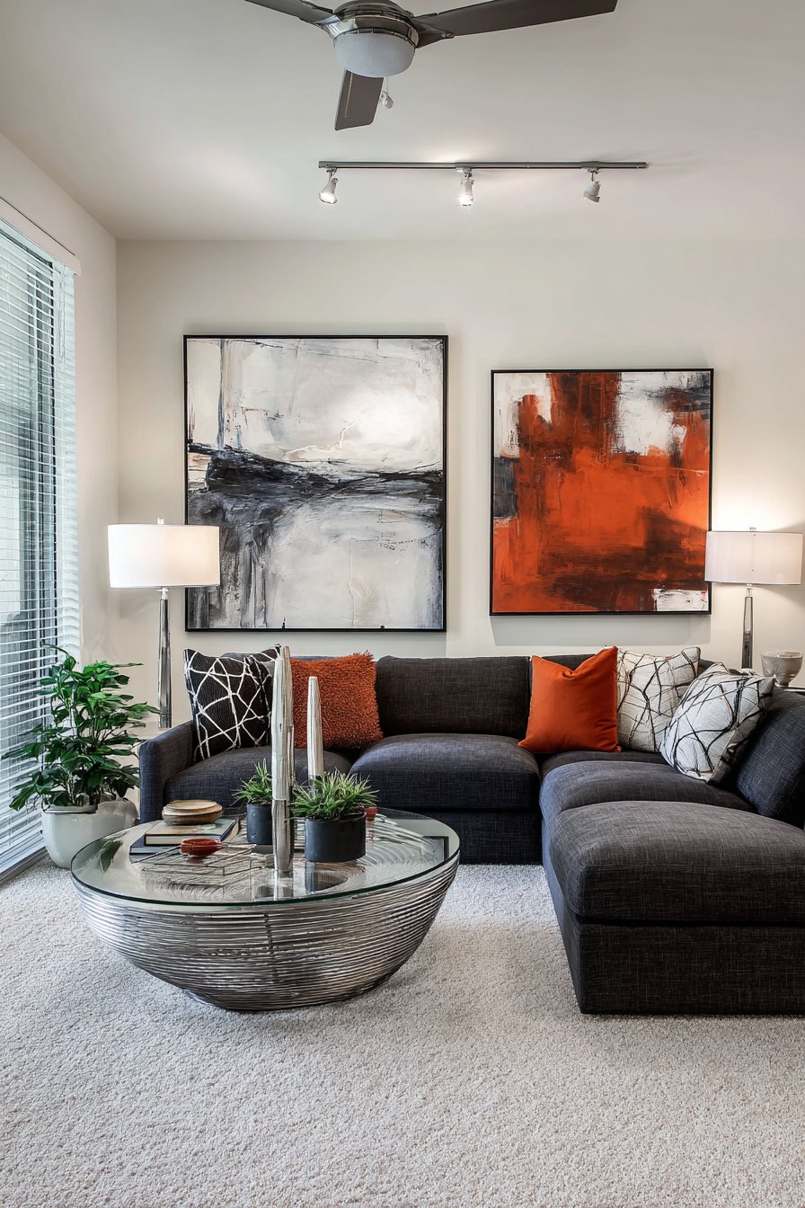 Key Design Tips: Choose modular furniture that reconfigures for different needs; use charcoal or dark grey as sophisticated neutral base; Incorporate glass and chrome for sleek contemporary style; add bold geometric pillows for changeable color impact; install track lighting for flexible, focused illumination; Display contemporary art with gallery-style presentation; maintain clean lines throughout furniture selections; celebrate transparency and honest materials; ensure furniture can adapt as your life changes; mix neutral foundations with bold accent moments; embrace minimal ornamentation for contemporary sophistication.