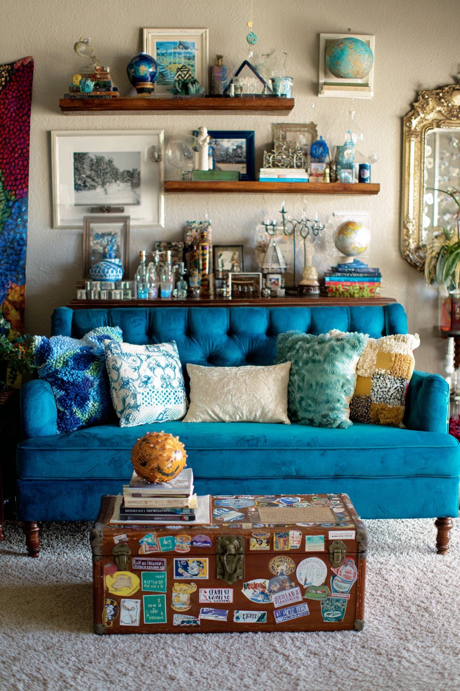 This personality-rich living room celebrates eclectic design by fearlessly mixing periods, styles, and sources into a cohesive whole that tells your unique story. The vintage velvet sofa in peacock blue becomes the jewel of the room, its saturated color and luxurious texture making an unforgettable statement. Whether genuinely vintage or vintage-inspired, this piece sets the tone for a space where conventional matching is abandoned in favor of collected character.