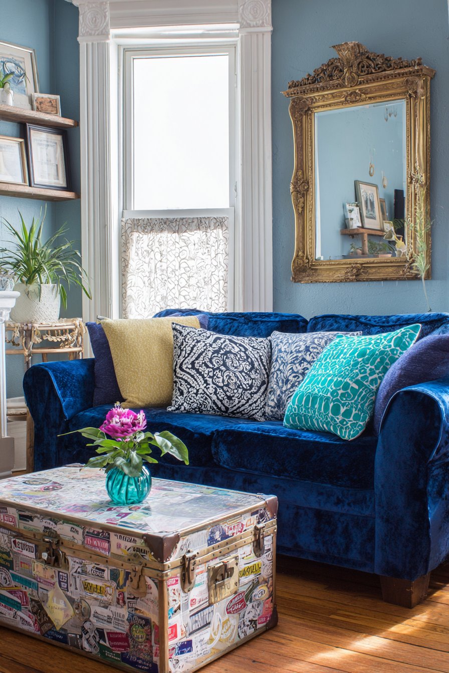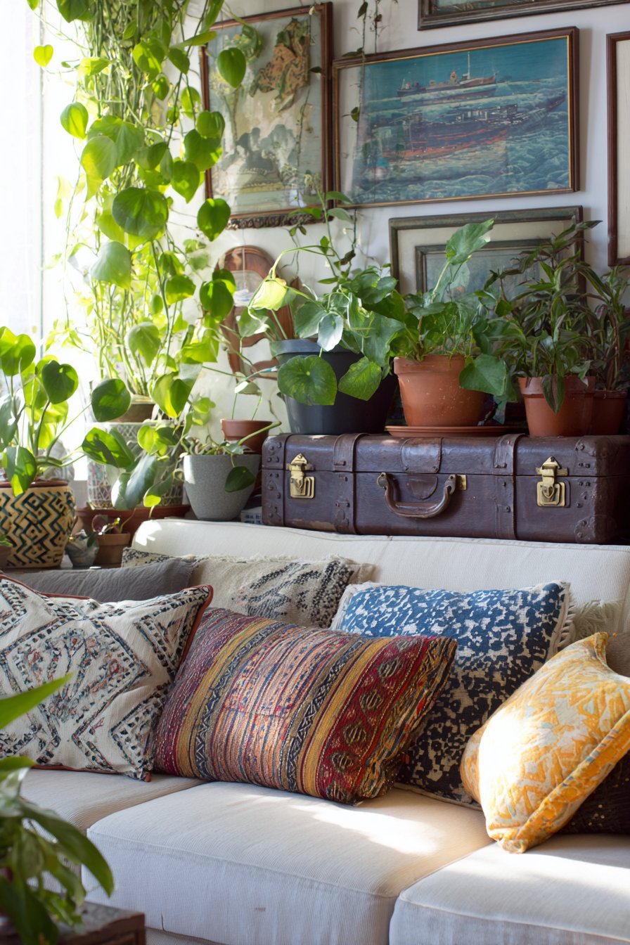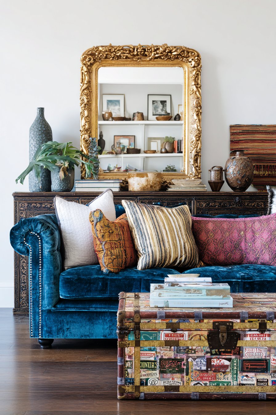 A repurposed trunk coffee table covered in travel stickers creates conversation and nostalgia—imagine vintage hotel labels, national park stickers, and travel destinations accumulated over years, each one sparking memories and stories. This piece exemplifies eclectic design’s celebration of personal history over catalog-perfect coordination. Mismatched throw pillows in various patterns and textures—perhaps ikat, suzani, velvet, and embroidered designs—create a collected look that suggests accumulation over time rather than one-day purchasing.