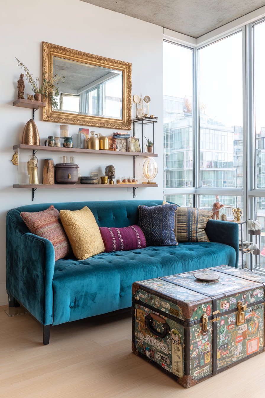 An antique gilt mirror with ornate frame reflects light while adding glamorous vintage elegance, its golden tones warming the cool peacock blue and creating visual richness. Global-inspired textiles and artifacts displayed on floating shelves might include Moroccan pottery, Indian block prints, Turkish kilim fragments, or Mexican folk art—each piece chosen for personal meaning rather than design coordination. The photography combines natural and artificial lighting to celebrate this curated, personality-filled space where every item has a story and conventional rules don’t apply.