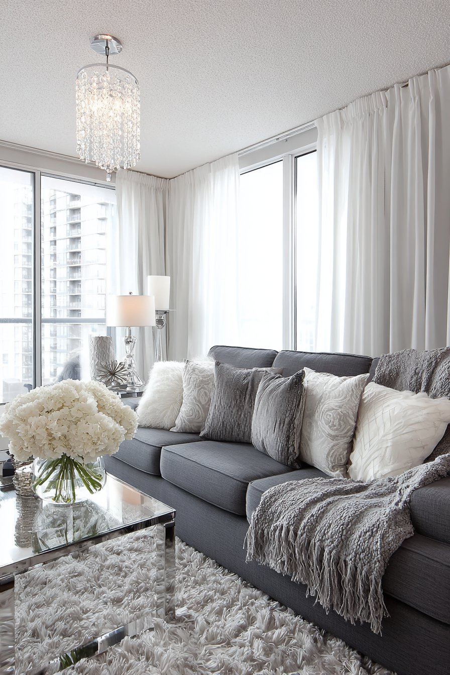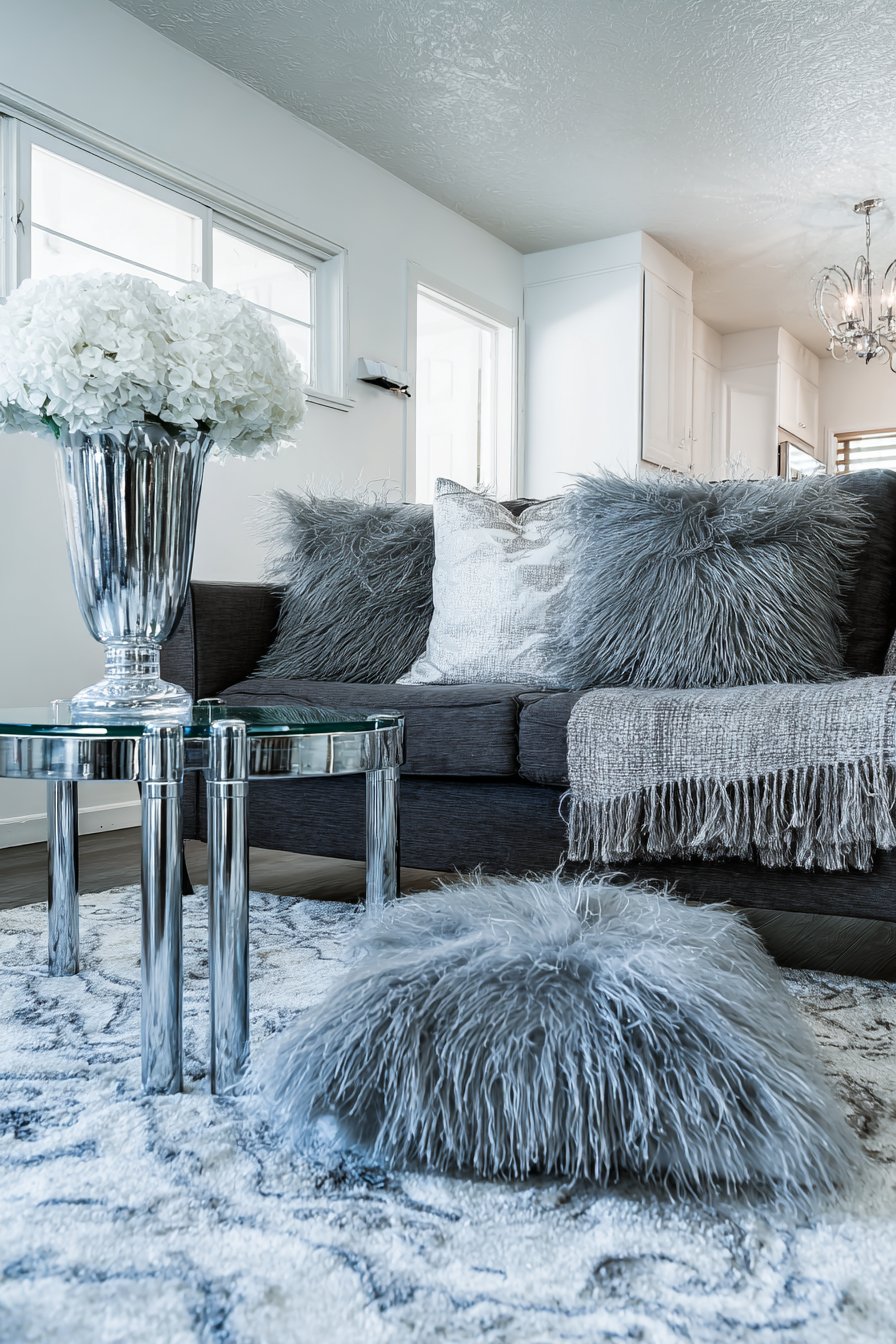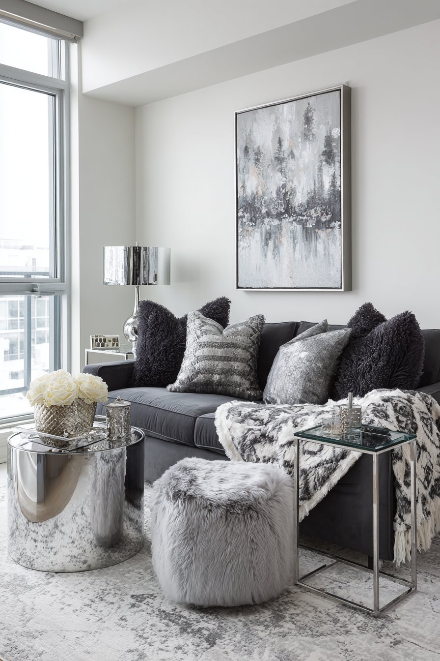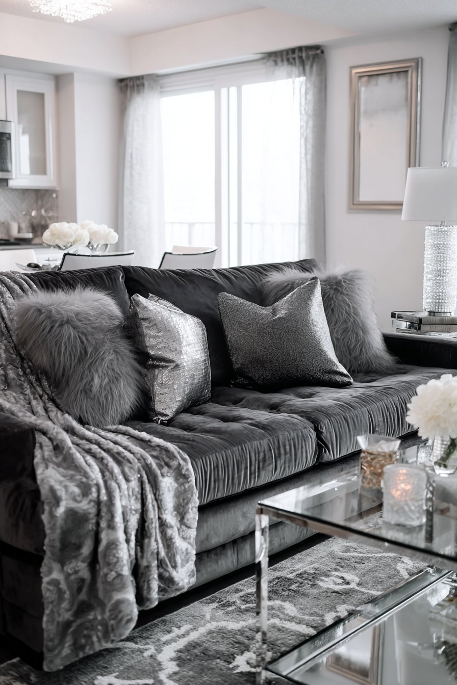 Chrome and glass accent tables maintain the cool-toned palette while their reflective surfaces bounce light around the room, preventing the grey from feeling dark or oppressive. The glass tops provide surface area without visual weight—crucial in small apartments where maintaining sight lines helps spaces feel larger. Varying textures prevent the monochromatic scheme from becoming monotonous—imagine smooth velvet next to chunky knit next to crisp linen next to glossy ceramic, each material catching light differently and providing tactile variety.