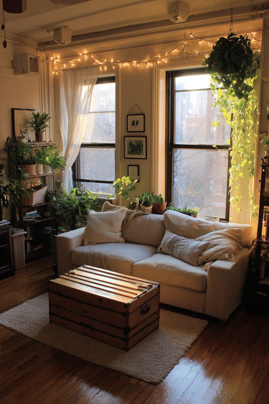 Affordable string lights add ambiance without electrician costs, their warm glow creating atmosphere for evening relaxation or entertaining. Plants propagated from cuttings (free from friends or your own plants) fill repurposed containers—perhaps vintage tins, thrifted vases, or painted mason jars—bringing life and color without nursery prices. Interior design photography with natural lighting celebrates this creative, resourceful approach to achieving charming apartment living on a budget, proving that investment and creativity matter far more than spending.