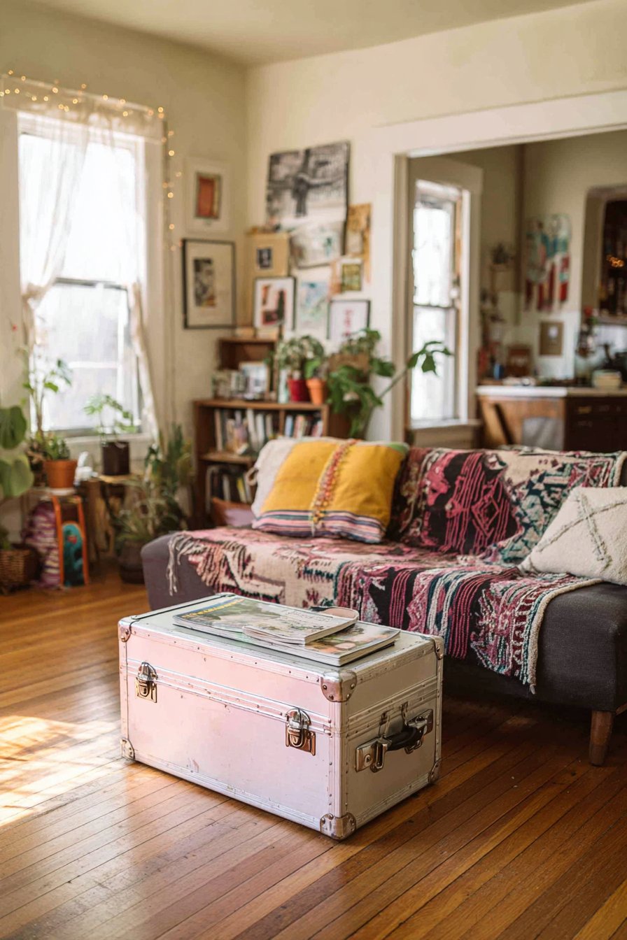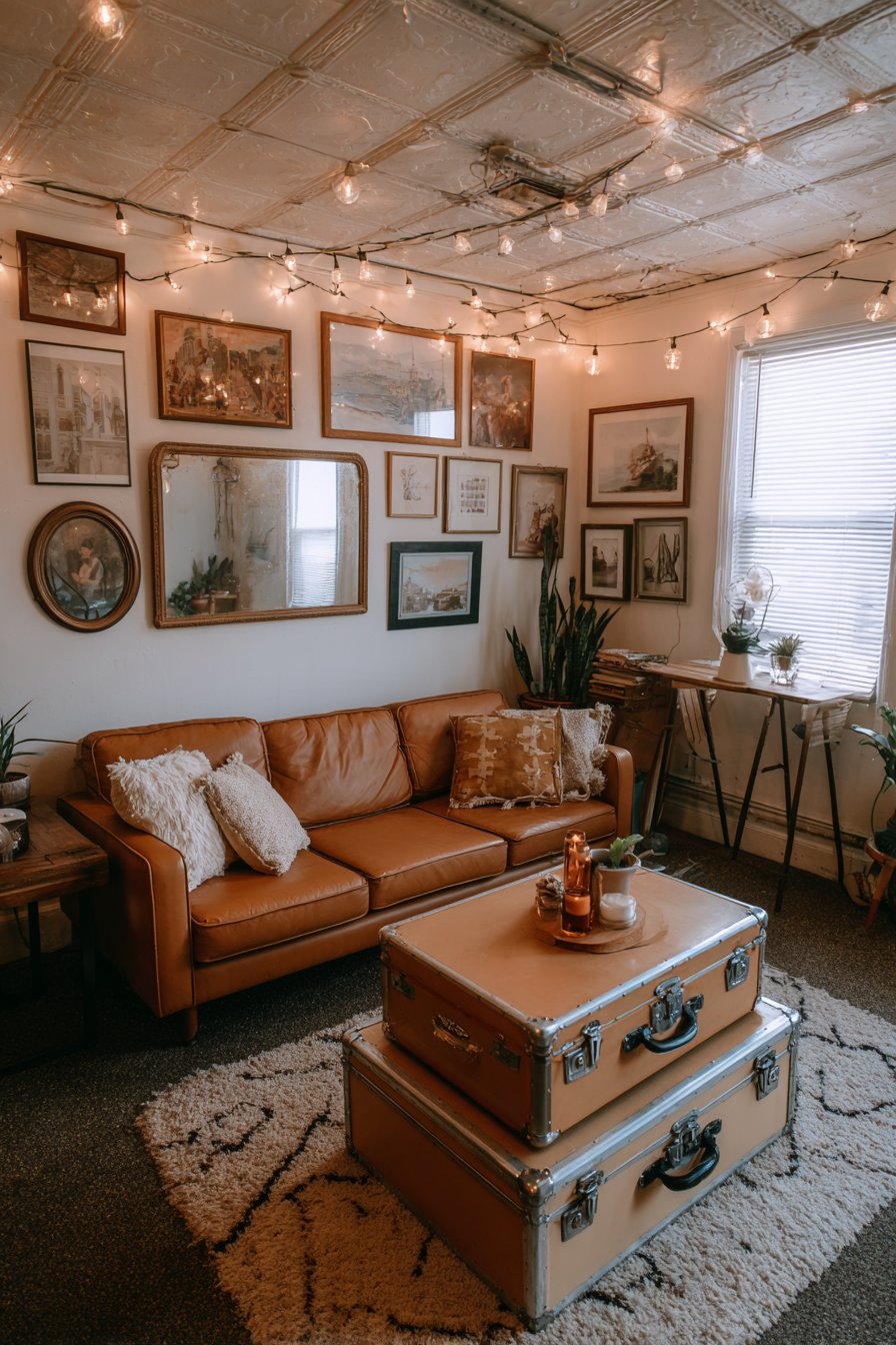 A DIY coffee table made from stacked vintage suitcases creates both storage (inside the cases) and surface area while adding serious character and conversation value. These might be genuine vintage finds from thrift stores or flea markets, their worn leather, vintage travel stickers, and brass corners telling stories while costing significantly less than new furniture. Thrifted artwork in mismatched frames creates an intentional gallery wall—the frames might be spray-painted in one coordinating color to create cohesion, while the varied art reflects your personal taste.