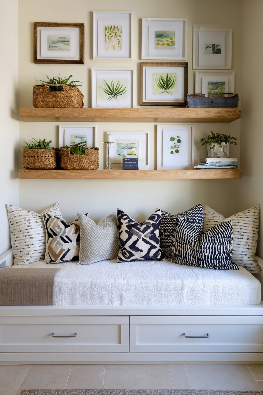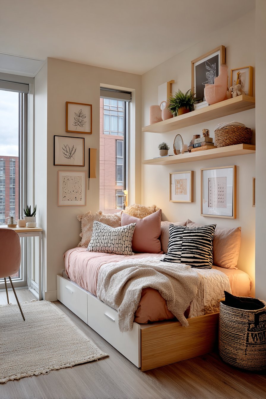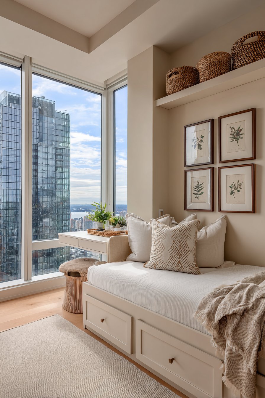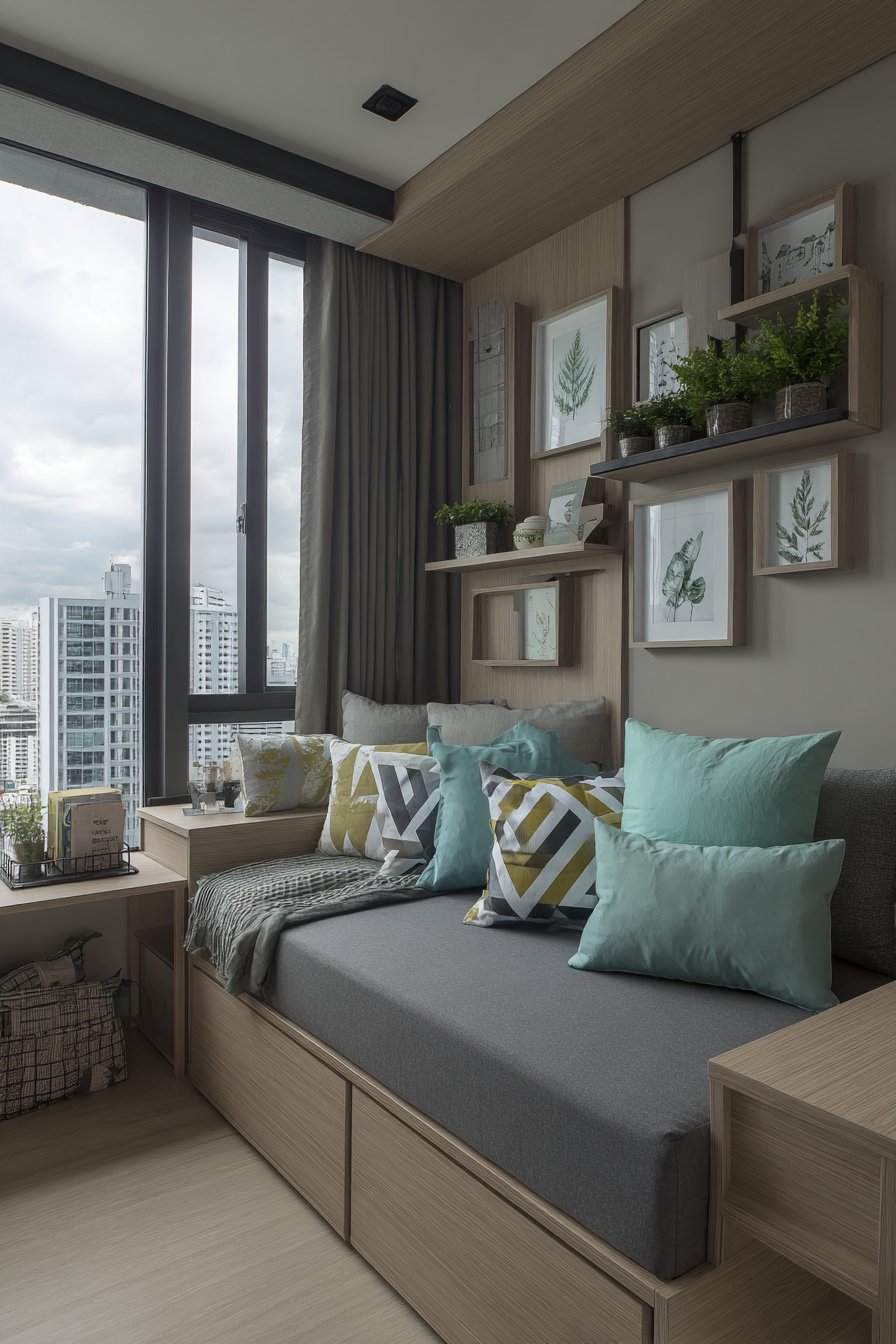 Key Design Tips: Select a daybed with storage to maximize functionality in limited square footage; install fold-down furniture for workspaces that disappear when not needed; use geometric patterns to add visual interest without overwhelming small spaces; incorporate floating shelves to free up floor space while providing display and storage; choose coordinating rather than matching pillows for a collected, layered look; add plants at varying heights to create depth and visual movement; ensure your furniture serves multiple purposes to justify its footprint in compact apartments.
