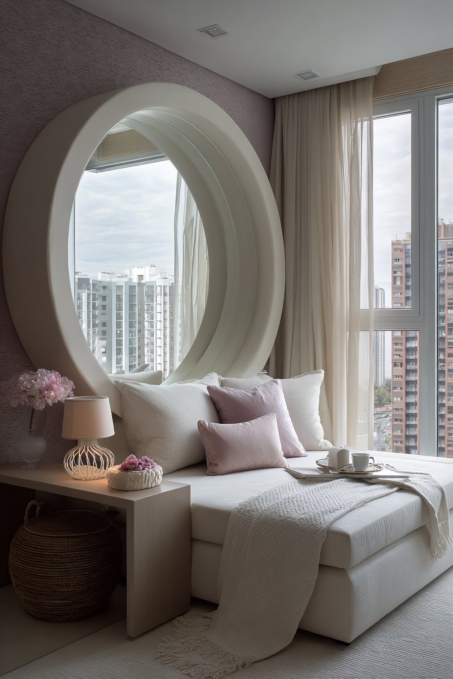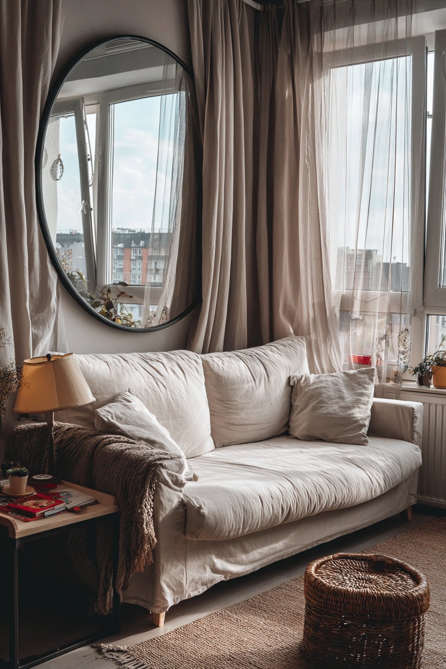 The essence of this living room lies in its commitment to creating visual spaciousness through carefully chosen elements that reflect and amplify light. A petite modern sofa in cream linen anchors the room with its clean lines and neutral palette, positioned strategically beneath a large round mirror that works magic by visually doubling the perceived space. This mirror placement is no accident—by reflecting the window opposite, it brings additional natural light into the room while creating the illusion of another window, making the apartment feel more open and connected to the outdoors.