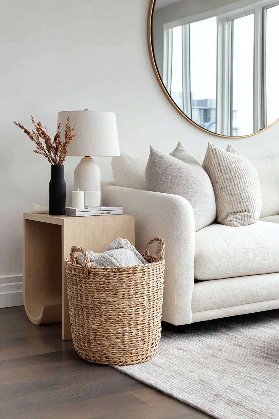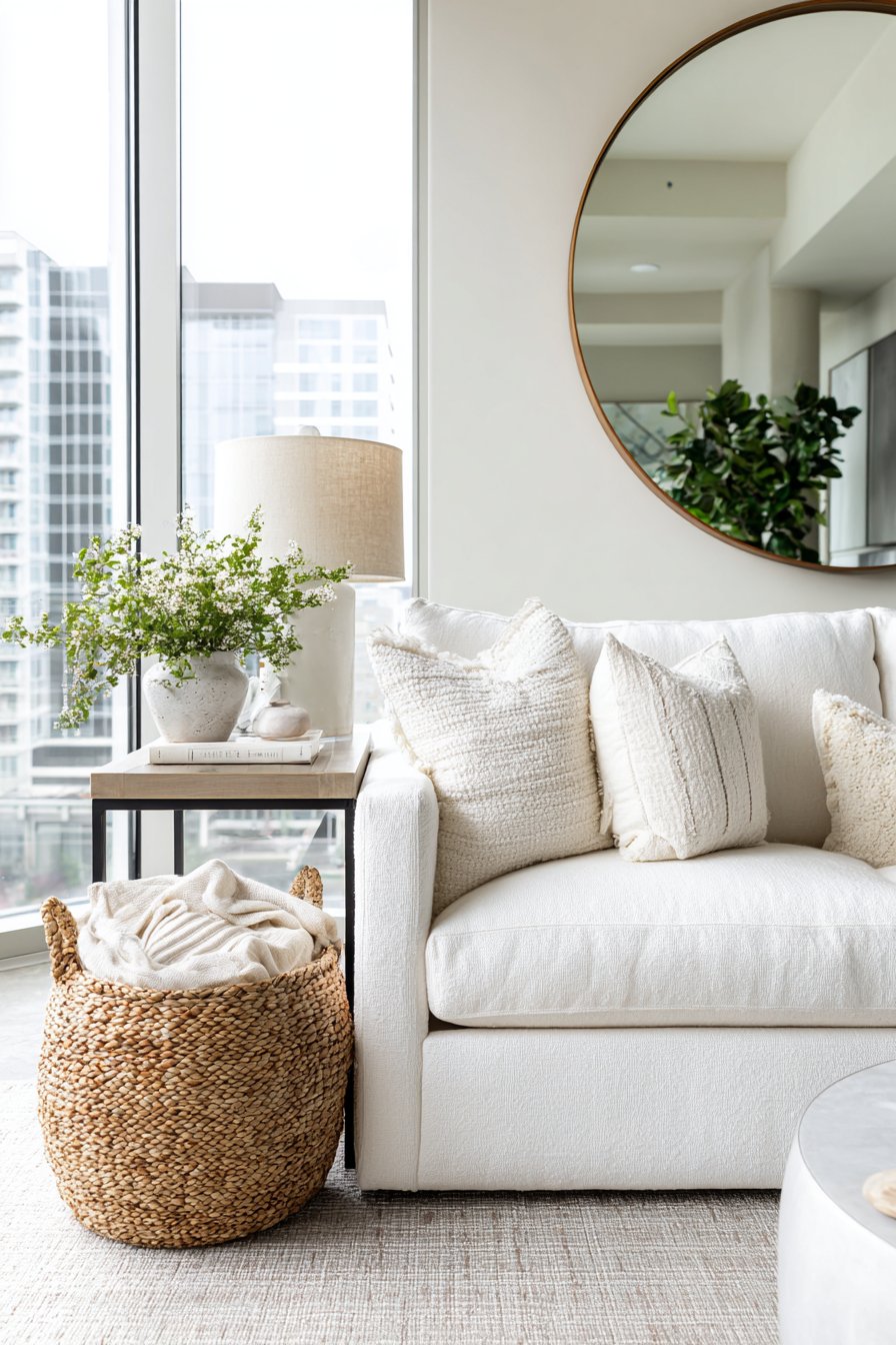 A woven basket in natural seagrass serves dual duty, storing extra throw blankets while functioning as a decorative element that introduces texture and organic warmth to the pale palette. The wide-angle perspective photography showcases how the clever use of reflective surfaces—from the mirror to the metallic table to the cream sofa’s subtle sheen—creates layers of light that make this compact apartment living room feel surprisingly spacious. The result is a space that feels open, calm, and effortlessly sophisticated despite its modest dimensions.