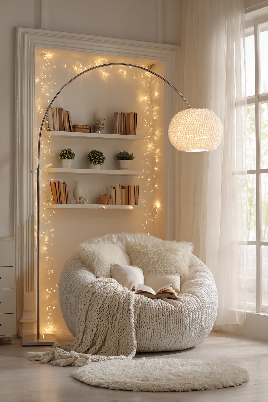 Key Design Tips: Create dedicated zones within your living room for specific activities; use papasan or bowl chairs for ultimate comfort in small footprints; install arc floor lamps to provide task lighting without claiming table space; arrange books by color for visual impact and easier selection; incorporate fairy lights for ambient evening lighting and magical atmosphere; position reading nooks near natural light sources whenever possible; layer different textures to create tactile richness that makes small spaces feel more luxurious; use floating shelves to display books and plants without furniture footprints.