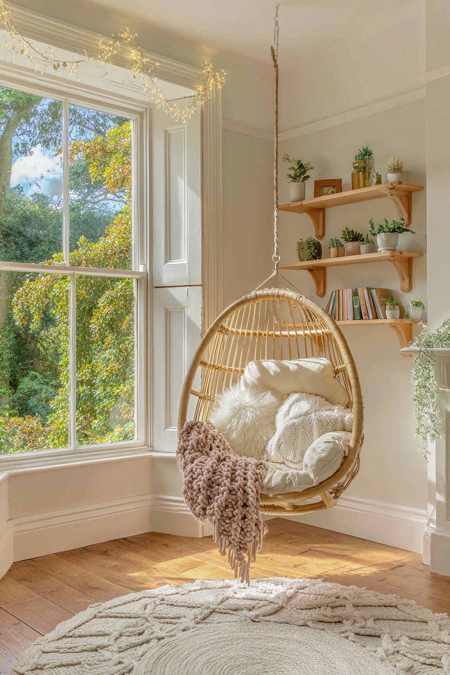 This delightful living room design dedicates precious square footage to creating a personal sanctuary—a corner reading nook that transforms unused space into your favorite spot in the apartment. The centerpiece is a comfortable papasan chair, that iconic bowl-shaped seat that cradles you in complete comfort, adorned with fluffy cushions in cream and grey tones and a chunky knit throw in soft blush. This setup invites hours of reading, relaxation, or simply gazing out the window while enjoying your morning coffee.