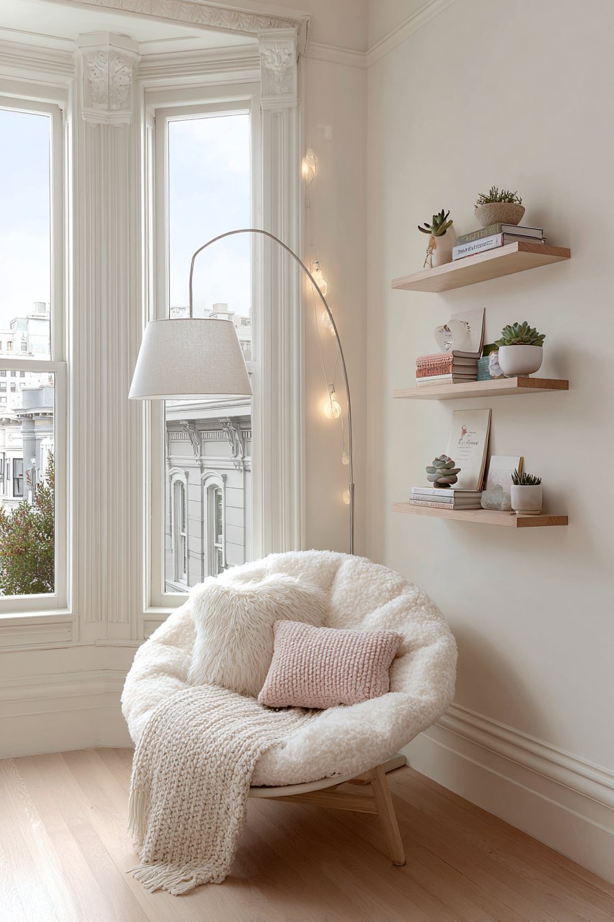A tall arc floor lamp curves gracefully over the seating area, providing focused lighting that’s perfect for reading without the harsh glare of overhead fixtures. The lamp’s adjustable nature means you can direct light exactly where you need it, whether you’re deep in a novel or working on a craft project. Wall-mounted floating shelves create a personal library within arm’s reach, displaying a curated collection of beloved books arranged by color or size, interspersed with small succulent arrangements in ceramic planters that bring life and color to the display.
