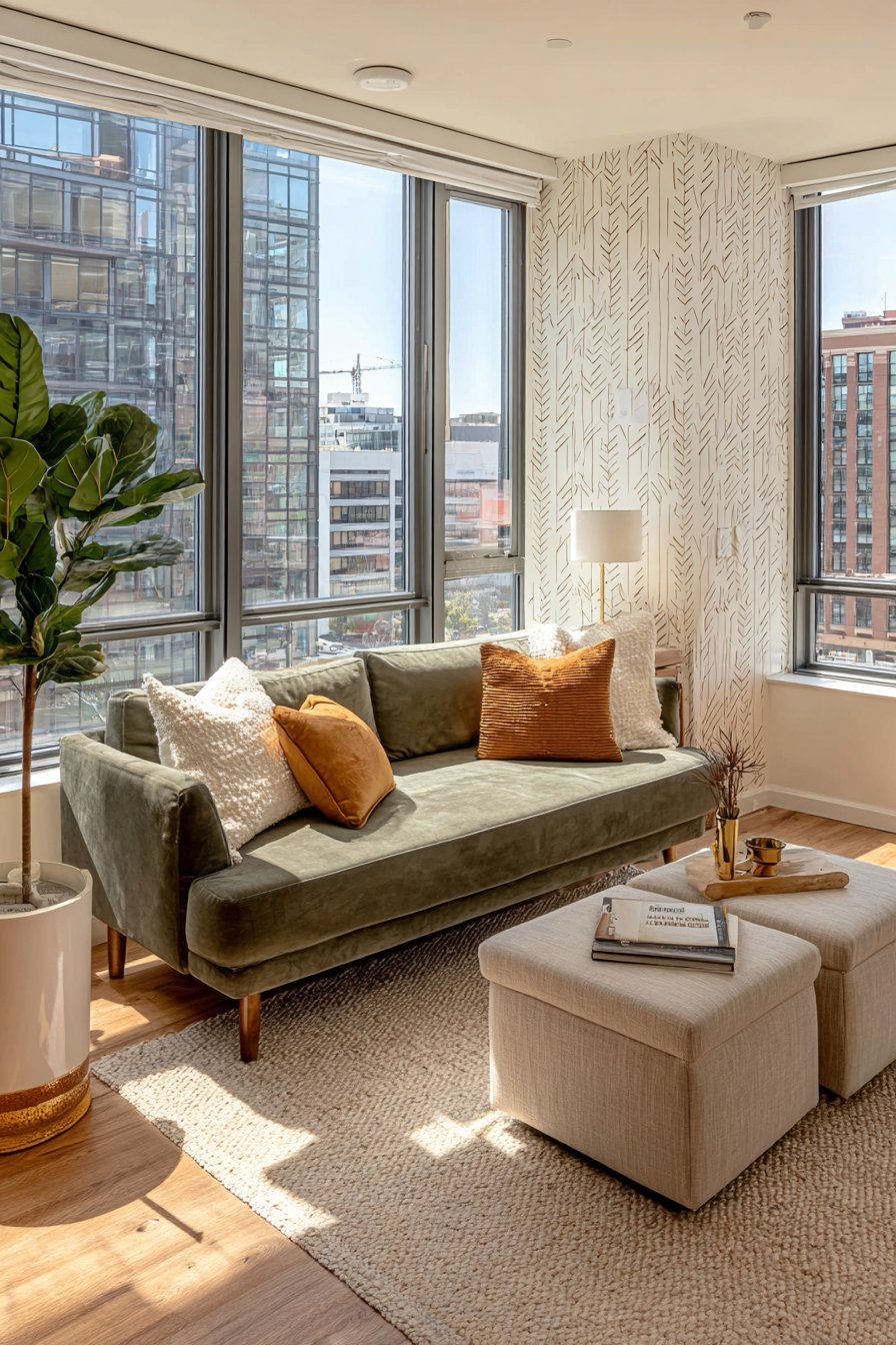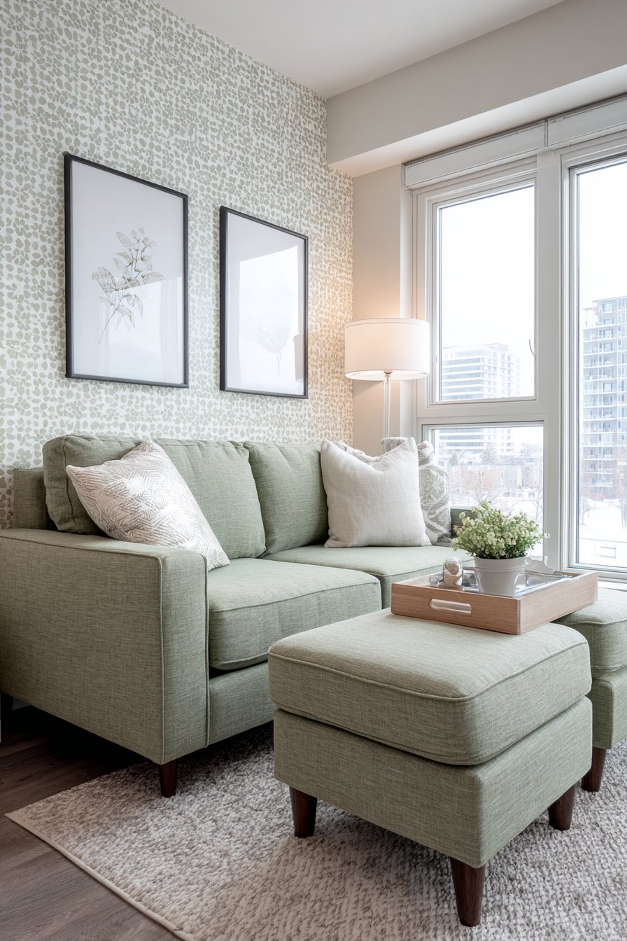 This contemporary apartment living room demonstrates how a single bold color choice can define an entire space while maintaining modern sophistication. The low-profile sofa in sage green fabric becomes the room’s statement piece, its muted yet distinctive hue bringing nature-inspired calm while the tapered wooden legs add mid-century modern character. Mixed metallic accent pillows in brass, copper, and brushed nickel create visual interest and catch light beautifully, their shimmer providing luxury touches that elevate the overall design.
