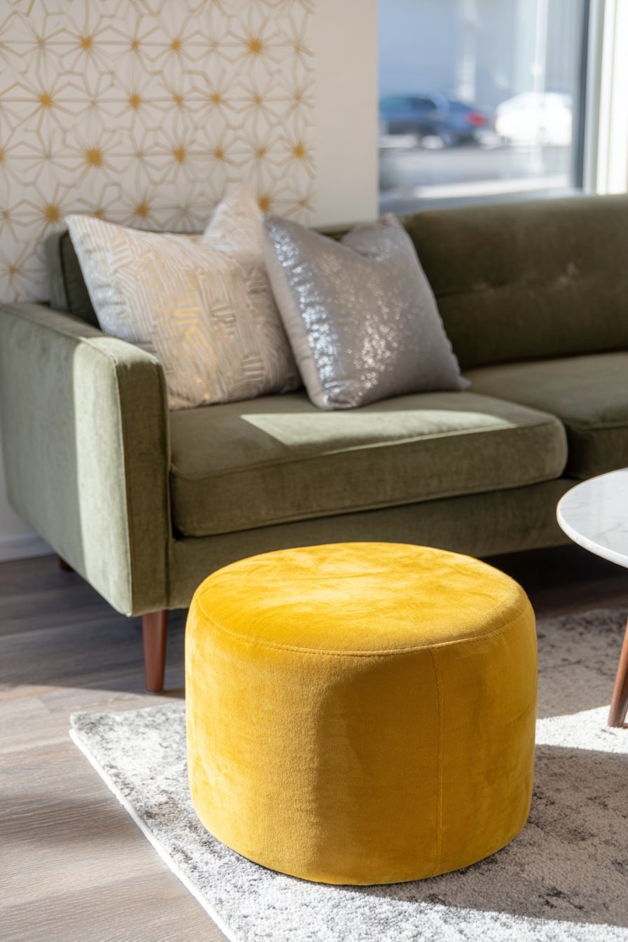 Key Design Tips: Choose one statement color for your main furniture piece to anchor the design; use removable wallpaper to create accent walls without damaging surfaces; incorporate metallic accents in multiple finishes for depth and luxury; select nesting ottomans for maximum flexibility in seating and table surfaces; opt for low-profile furniture to make ceilings appear higher; mix warm and cool tones for visual complexity; ensure any major design choices are renter-friendly if you’re not in a permanent residence; use tapered legs on furniture to maintain visual lightness and make cleaning easier.