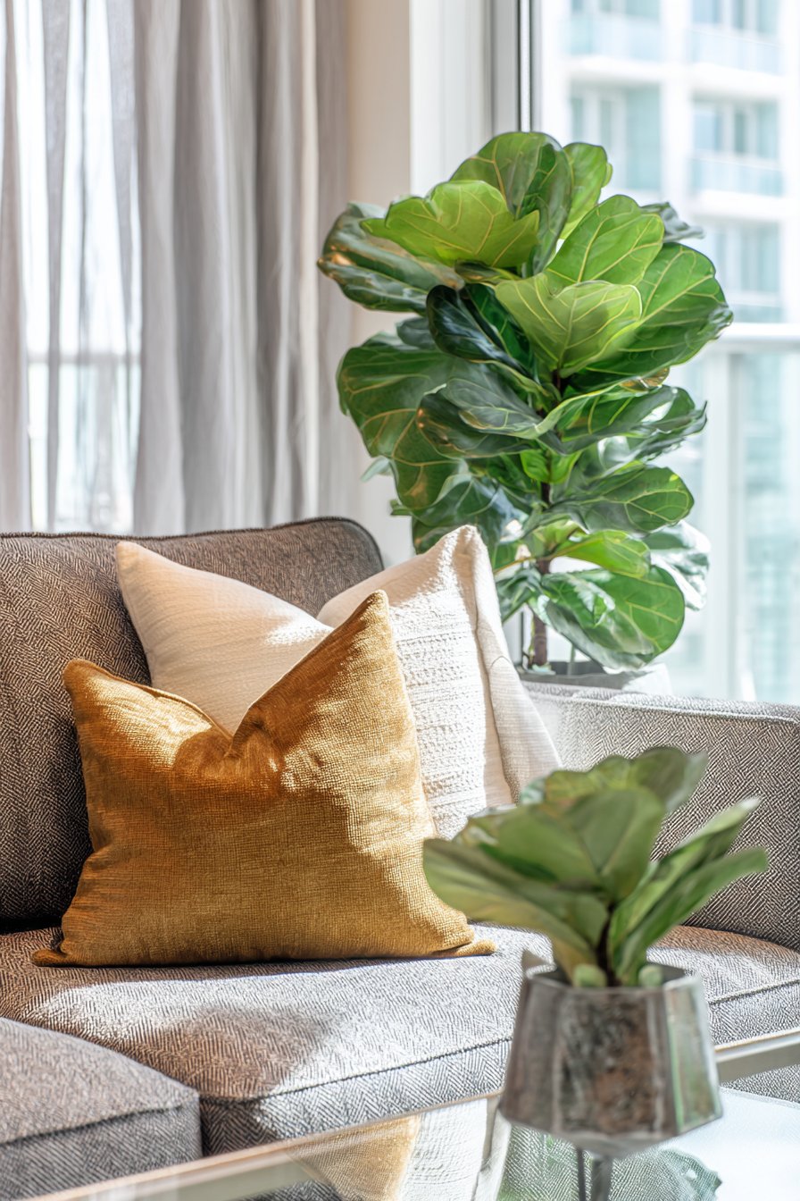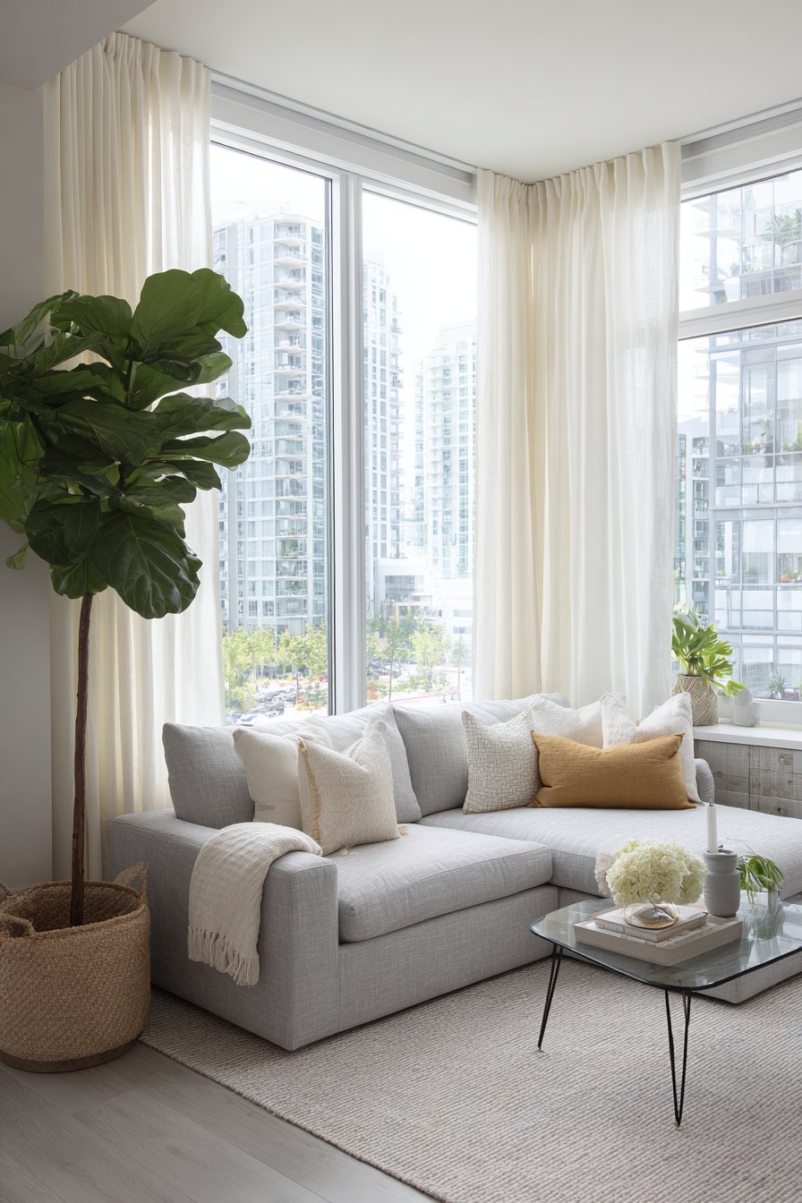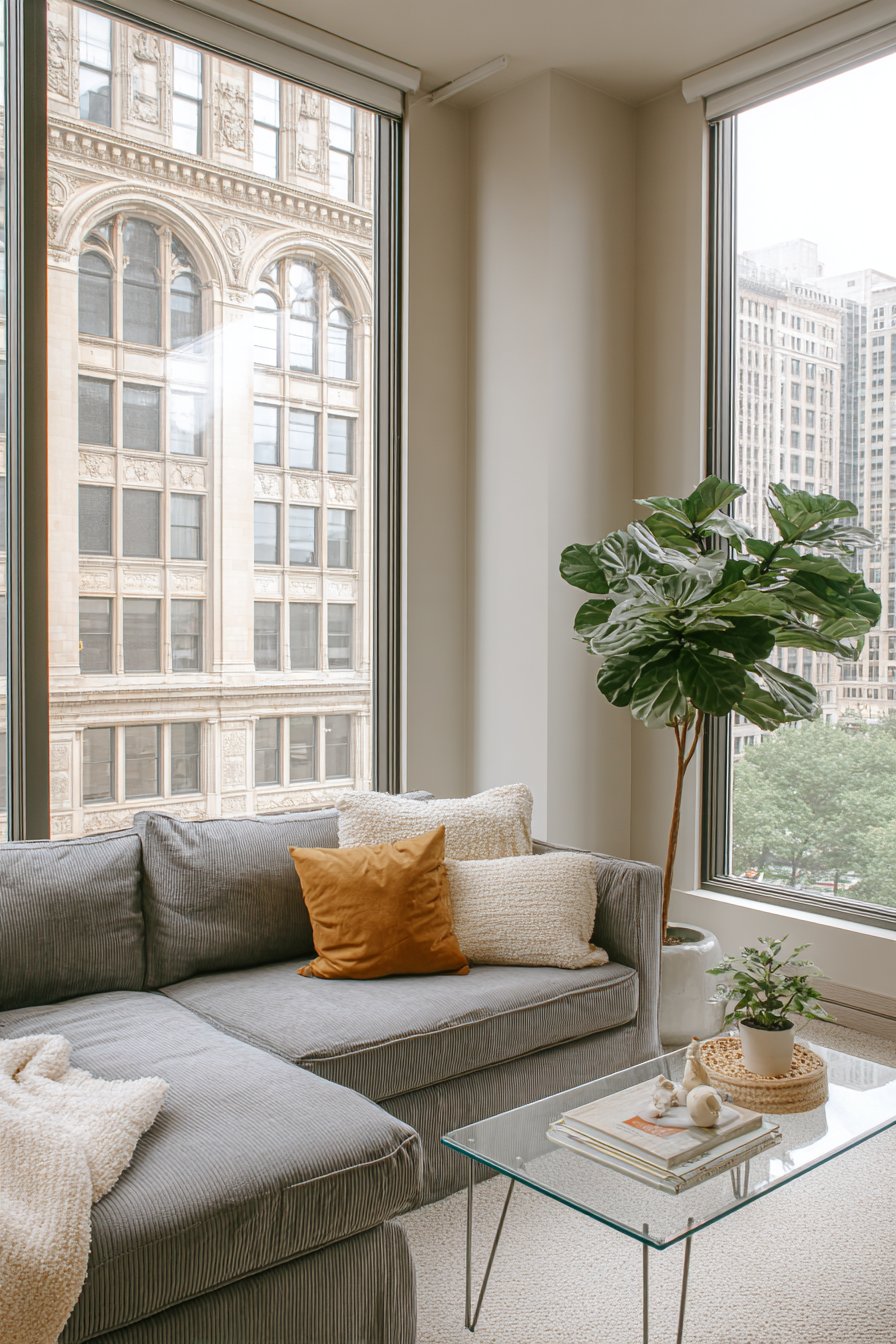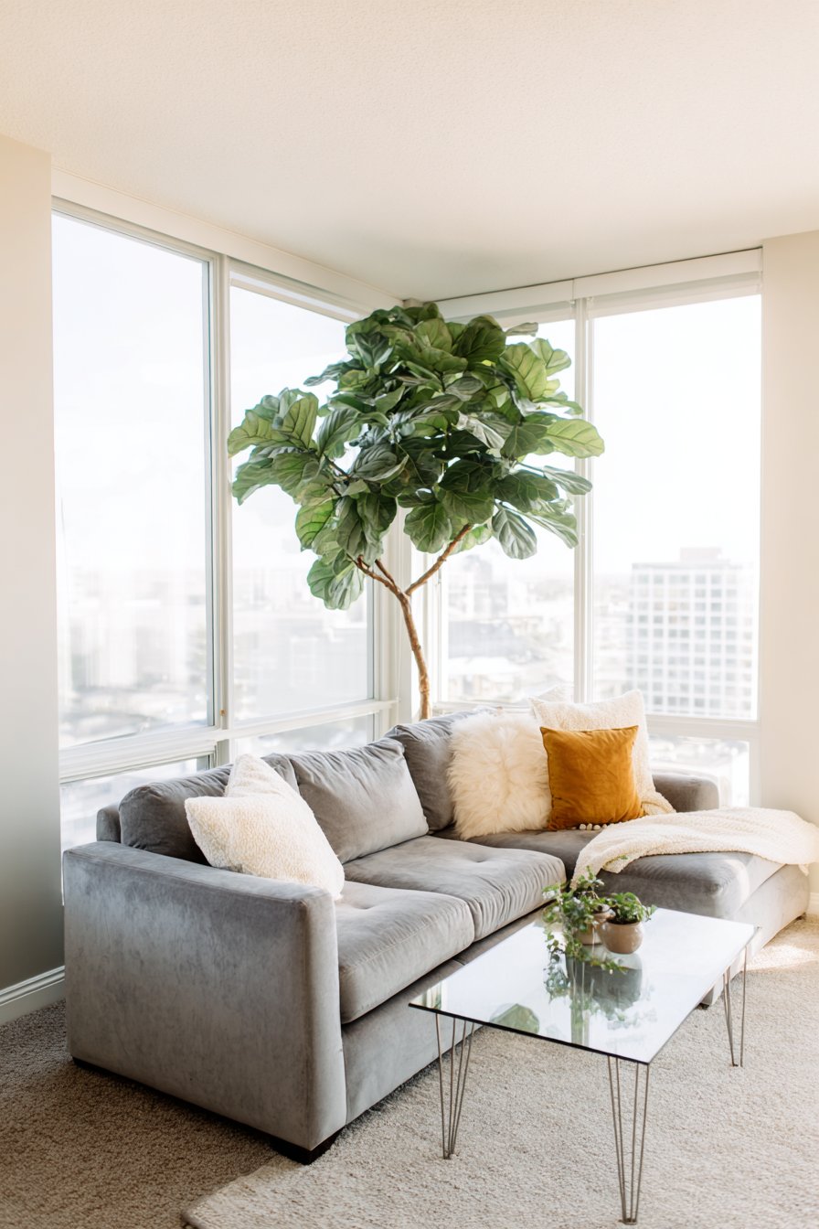 Key Design Tips: Embrace the Scandinavian principle of “lagom” (just right) by selecting only essential furniture; use L-shaped sectionals to define living areas in open-plan apartments; choose glass-topped tables to maintain visual openness and light flow; incorporate large statement plants like fiddle leaf figs for drama and air purification; add warmth to grey palettes with mustard, ochre, or warm cream accents; maximize natural light by keeping window treatments minimal; select furniture with visible legs to create a sense of spaciousness; invest in quality over quantity for a curated, intentional look.