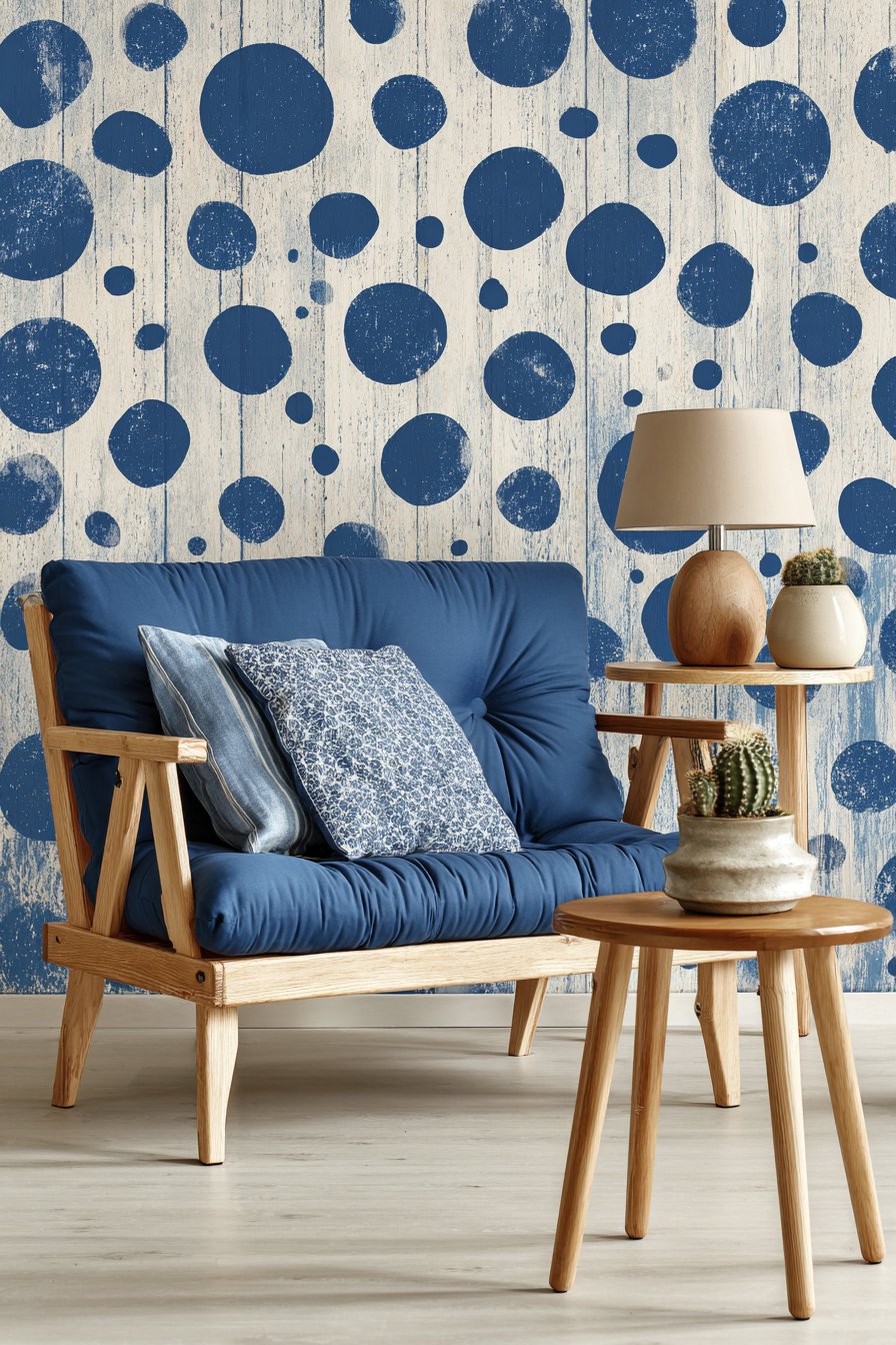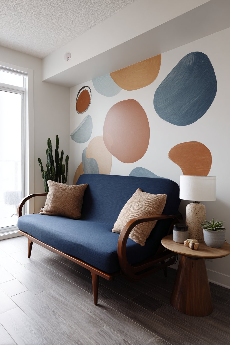 A round side table in natural wood continues the warm wood theme while its circular shape ensures safety and easy navigation in tight quarters—no sharp corners to bump into during midnight trips to the kitchen. This table holds a ceramic table lamp with a simple linen shade that provides soft ambient lighting, plus a small potted cactus that adds life without demanding much maintenance or space. Removable wall decals in abstract shapes inject personality and visual interest without the commitment or wall damage of traditional art or paint.
