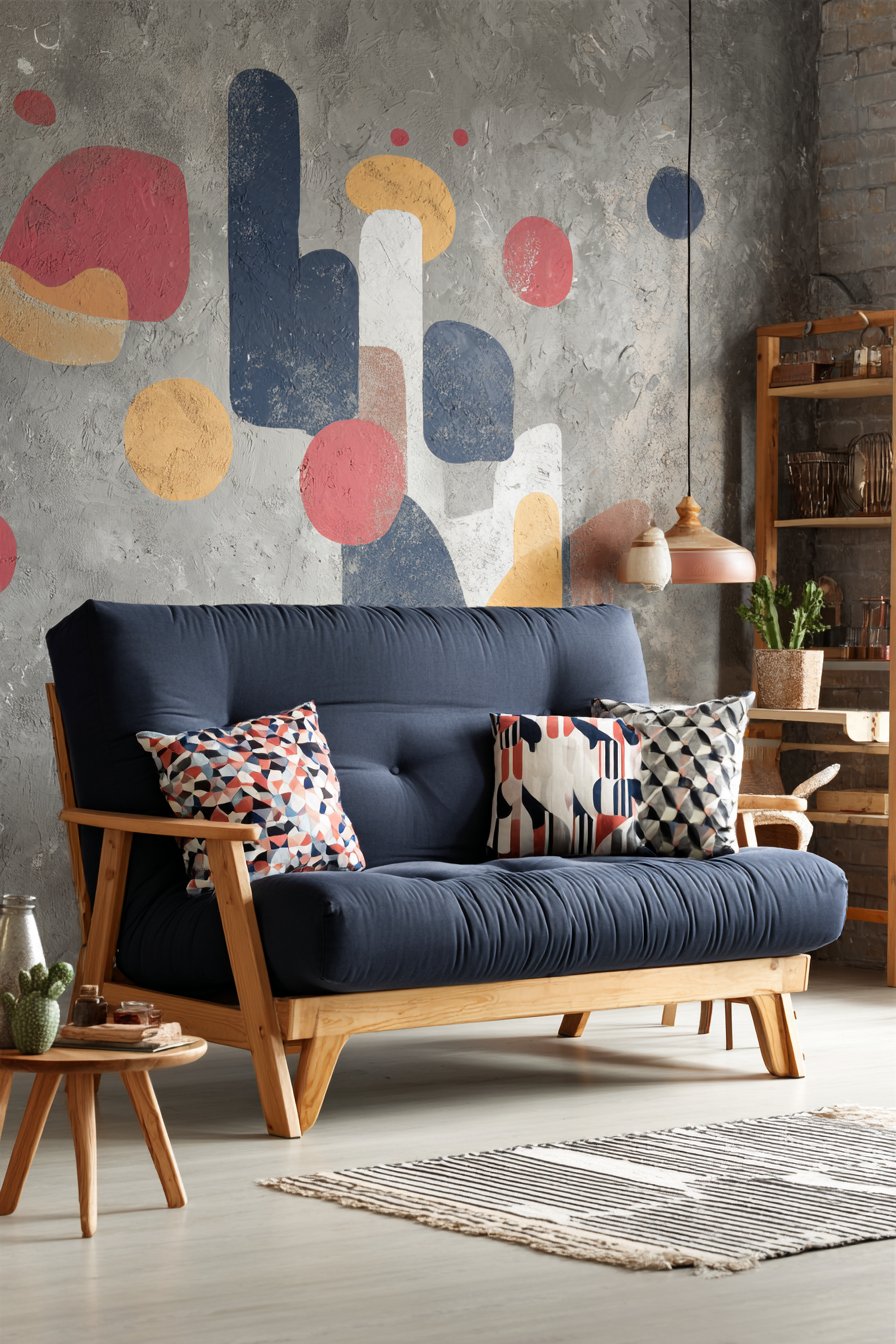 The professional interior photography with natural lighting captures this practical yet charming setup that’s ideal for studio apartment living where the living room must often serve multiple functions. The navy blue creates a sophisticated backdrop that works with various accent colors, allowing you to refresh the space’s look simply by changing throw pillows or accessories. This design proves that multi-functional furniture doesn’t mean compromising on style—with thoughtful selection, your futon can be just as attractive as a traditional sofa while offering significantly more flexibility.