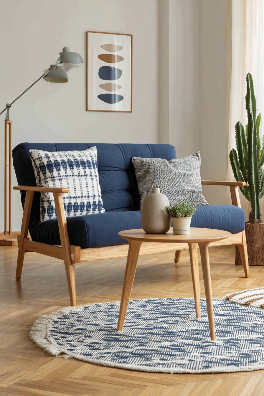 This practical living room design centers on a convertible futon sofa that epitomizes smart apartment living—stylish enough for daily use yet transforming effortlessly into a comfortable bed for overnight guests. The navy blue upholstery provides rich, saturated color that anchors the room while hiding wear and stains better than lighter alternatives. The mid-century modern wooden arms add architectural interest and warmth, their honey-toned wood creating beautiful contrast against the deep blue fabric.
