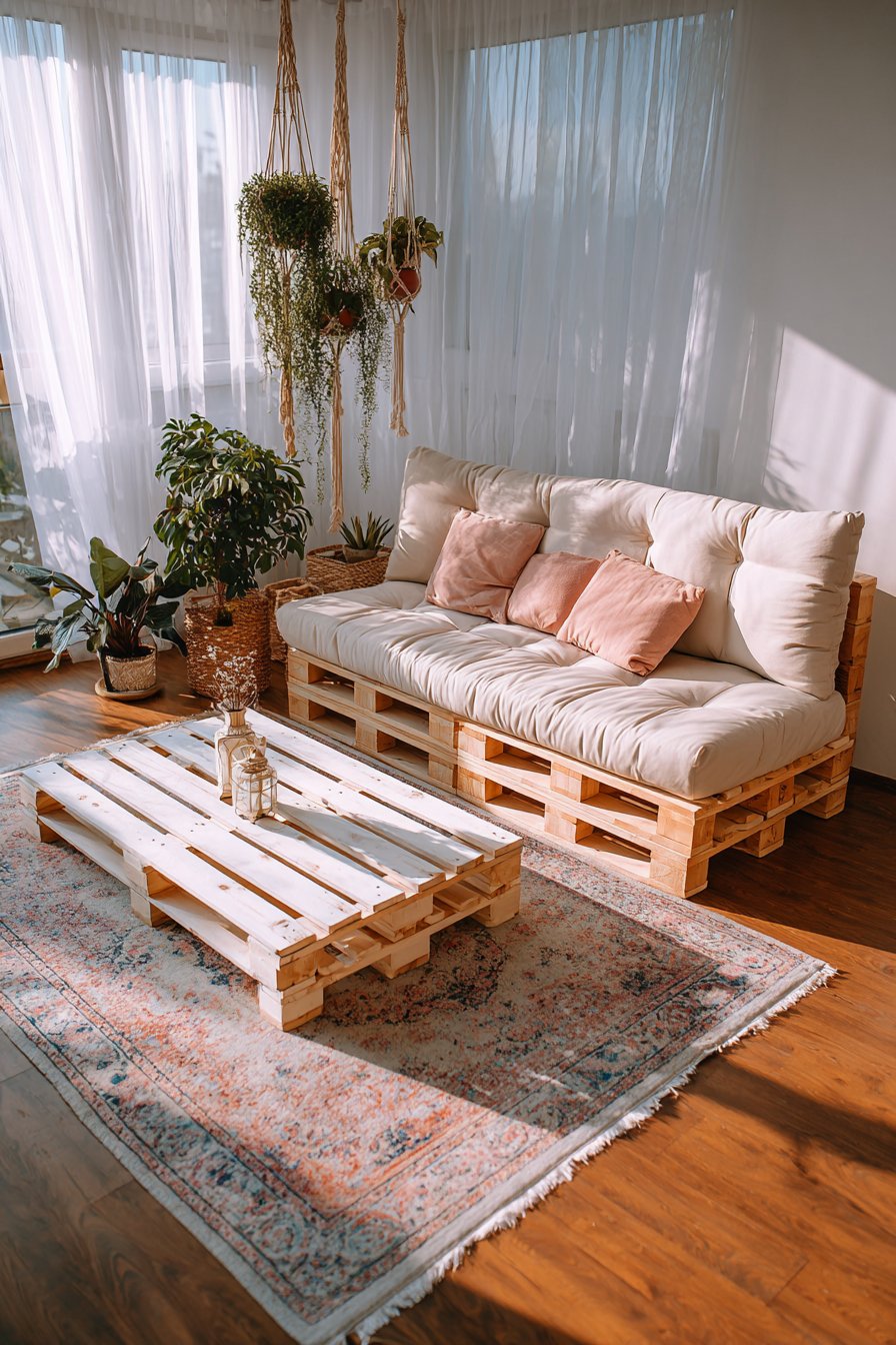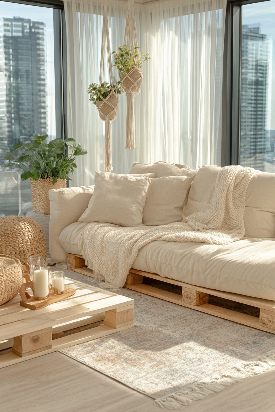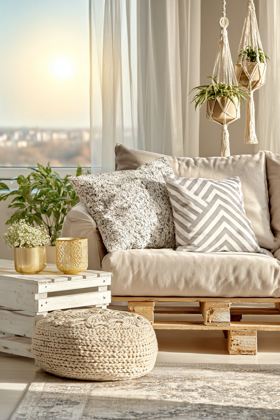 Key Design Tips: Embrace DIY projects like pallet furniture for unique, budget-friendly pieces; paint upcycled items in light colors for a fresh, cohesive look; use macramé plant hangers to add bohemian charm without floor space commitment; shop vintage and thrift stores for unique rugs and accessories; choose light, neutral colors to maximize brightness in small spaces; position furniture to capture the best natural light; create vertical interest with plants at varying heights; remember that great style comes from thoughtful curation rather than expensive purchases.