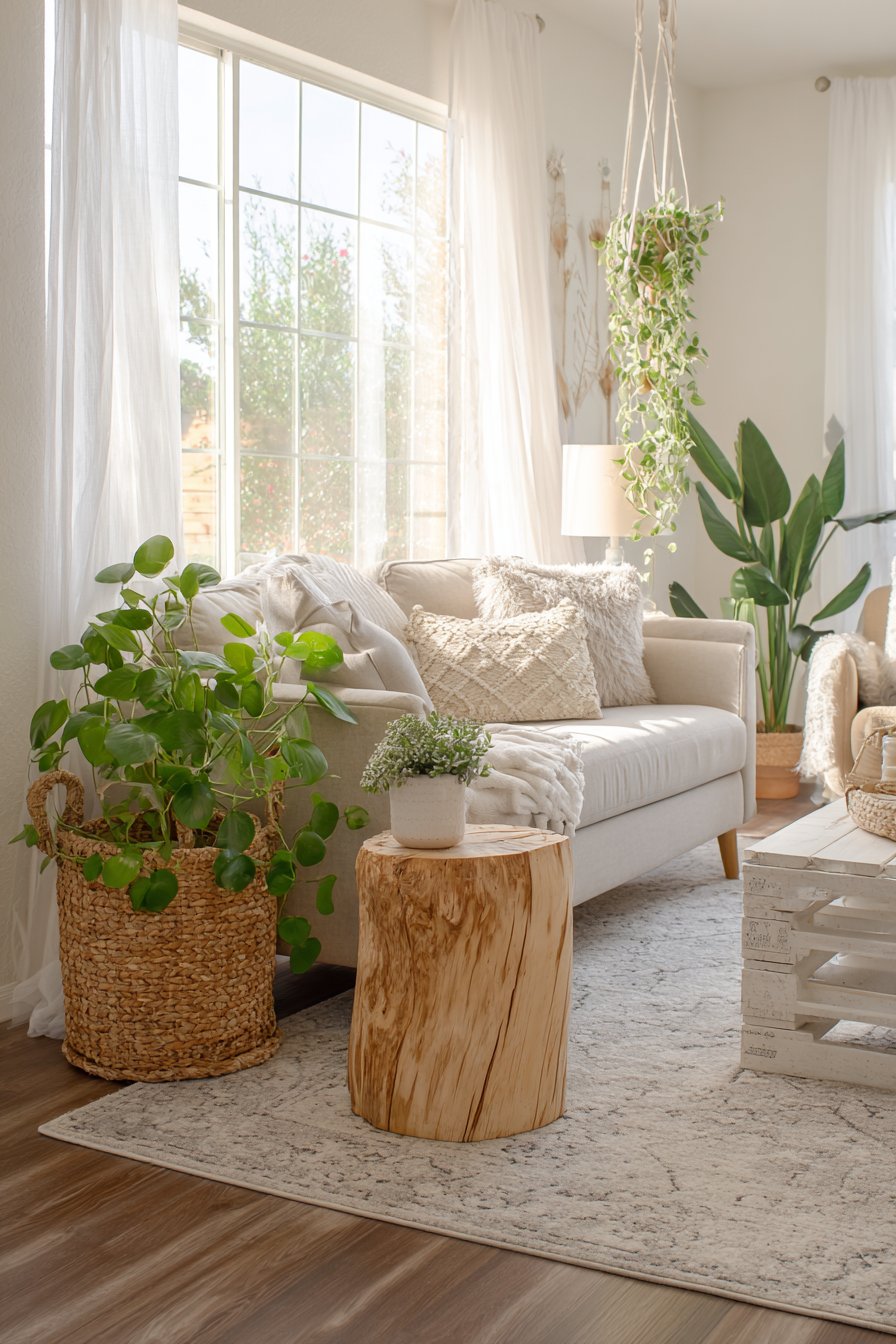 Floating shelves installed at varying heights showcase trailing pothos plants whose cascading vines soften the room’s edges and bring life to the vertical spaces. This strategic use of greenery not only purifies the air but also creates visual movement that makes the room feel more dynamic. The wide-angle composition captures how natural daylight streams through the window, illuminating the various textures—from the chunky knit of the throws to the smooth grain of the wood tables—and highlighting how smart furniture choices can make even compact spaces feel both cozy and surprisingly spacious.