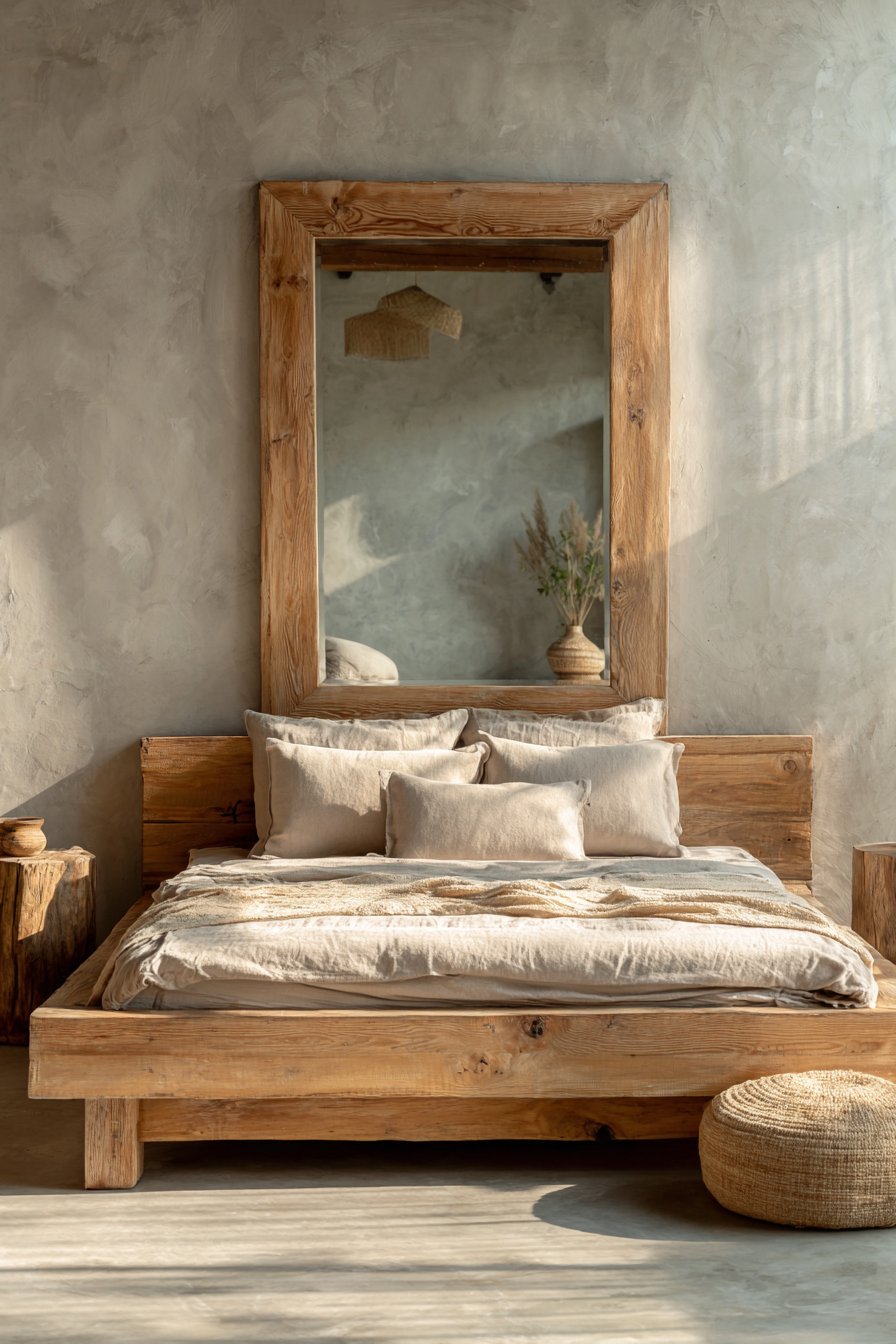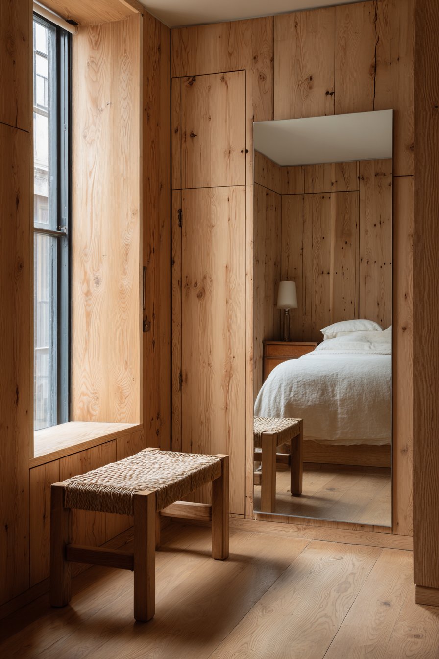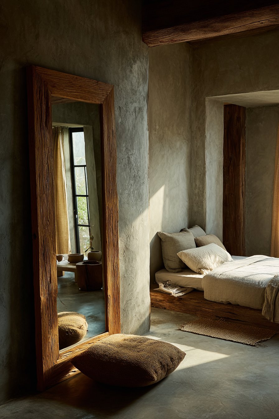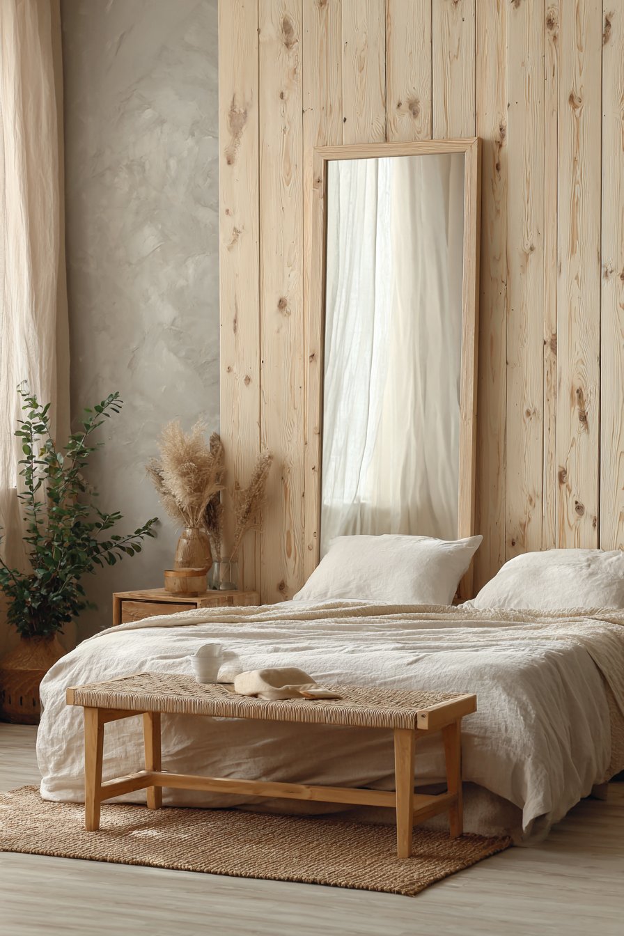 Soft morning light streaming through nearby windows creates gentle reflections that enhance the room’s tranquil atmosphere. A simple wooden bench with a woven seat positioned at the mirror’s base adds practical functionality—perfect for putting on shoes or laying out tomorrow’s outfit—while maintaining the design’s commitment to natural materials and functional beauty.