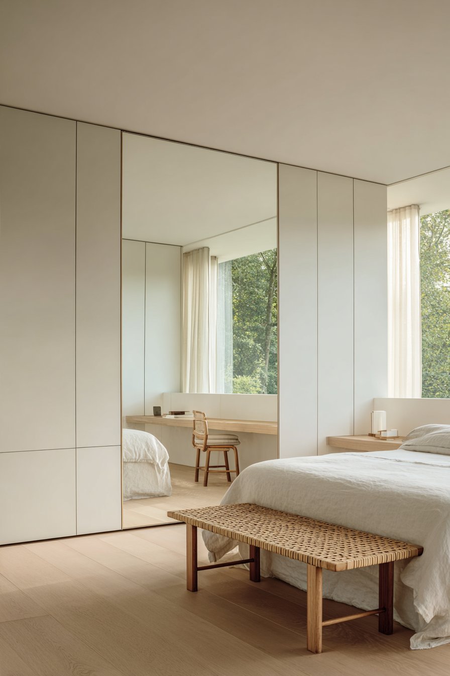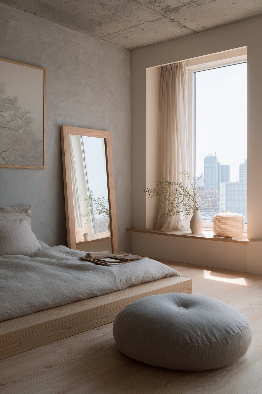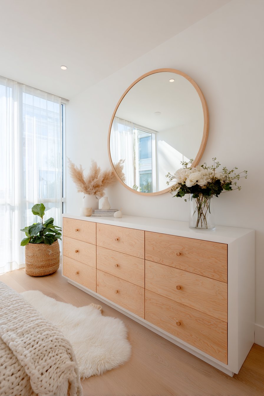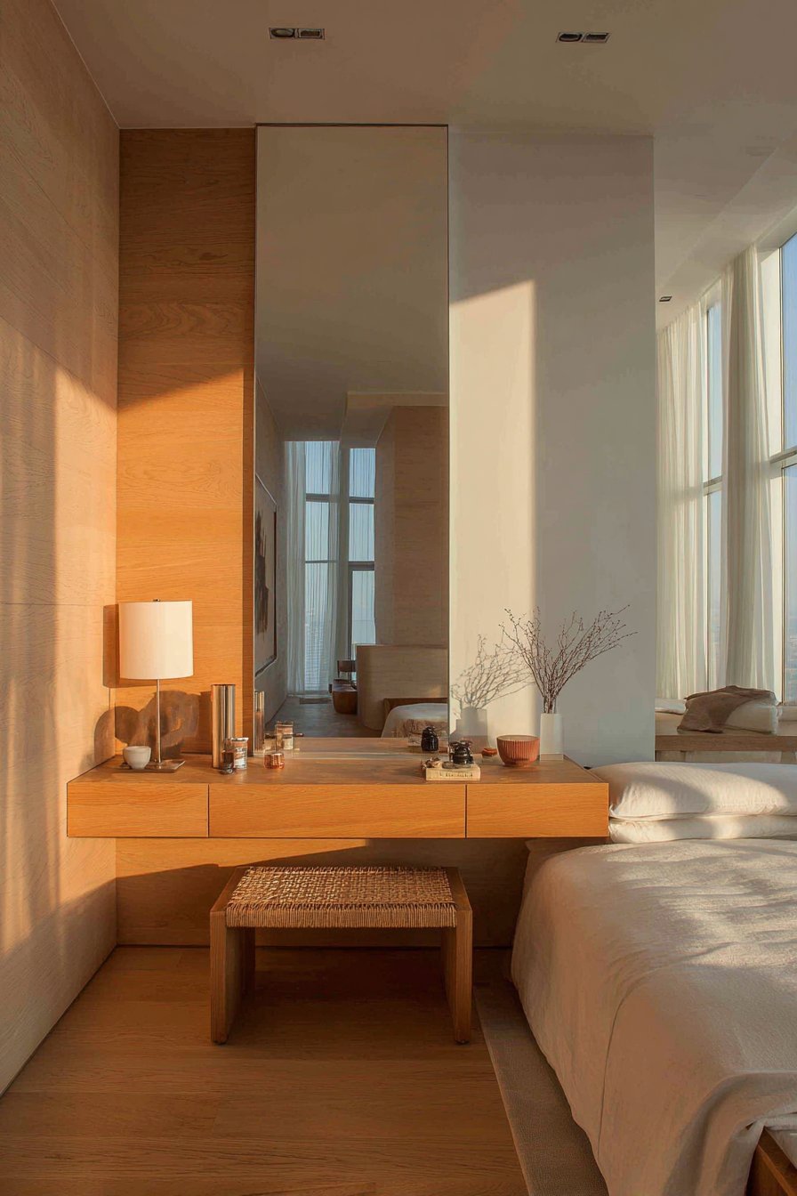Soft morning light streaming through nearby windows creates gentle reflections that enhance the room’s tranquil atmosphere. A simple wooden bench with a woven seat positioned at the mirror’s base adds practical functionality—perfect for putting on shoes or laying out tomorrow’s outfit—while maintaining the design’s commitment to natural materials and functional beauty.