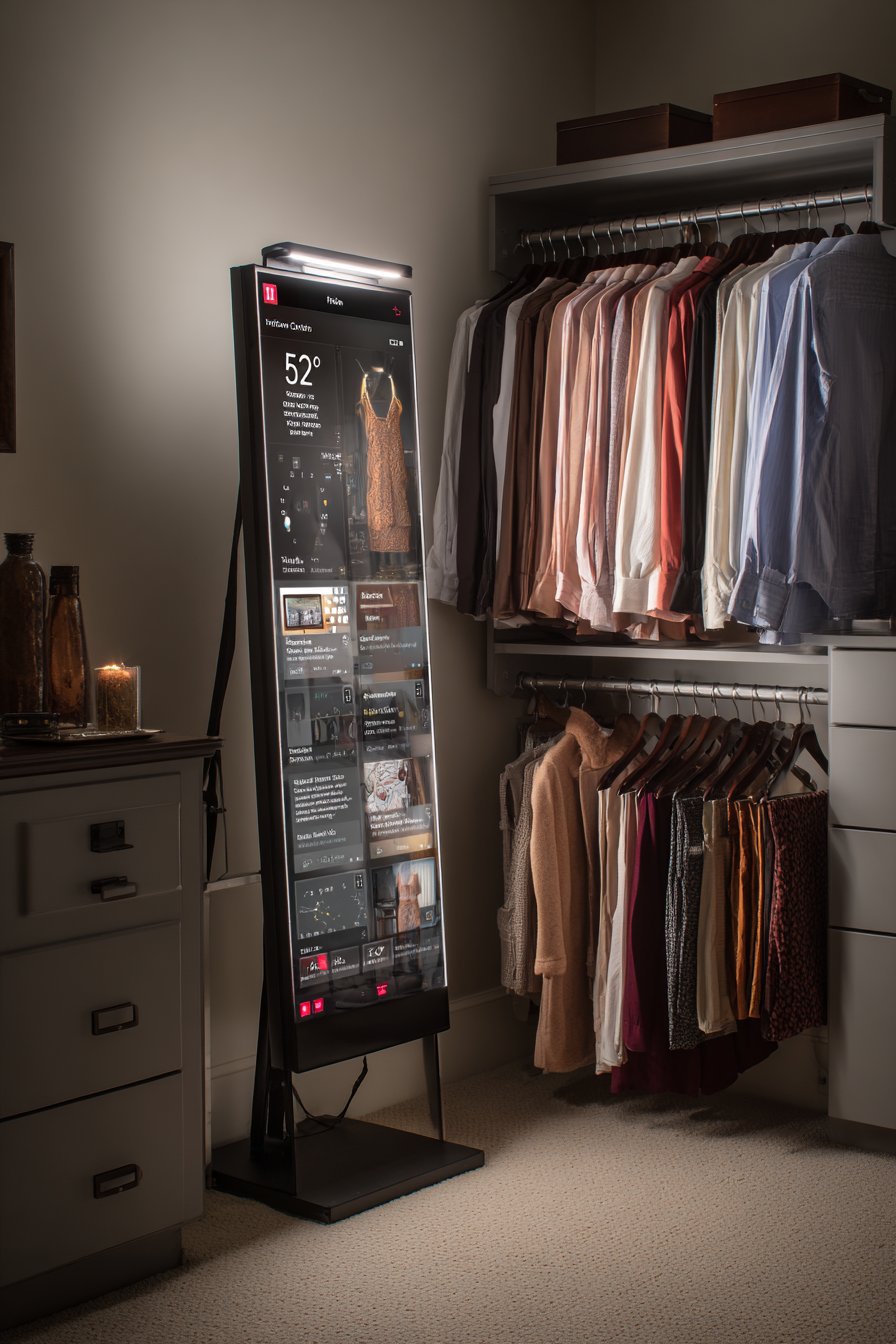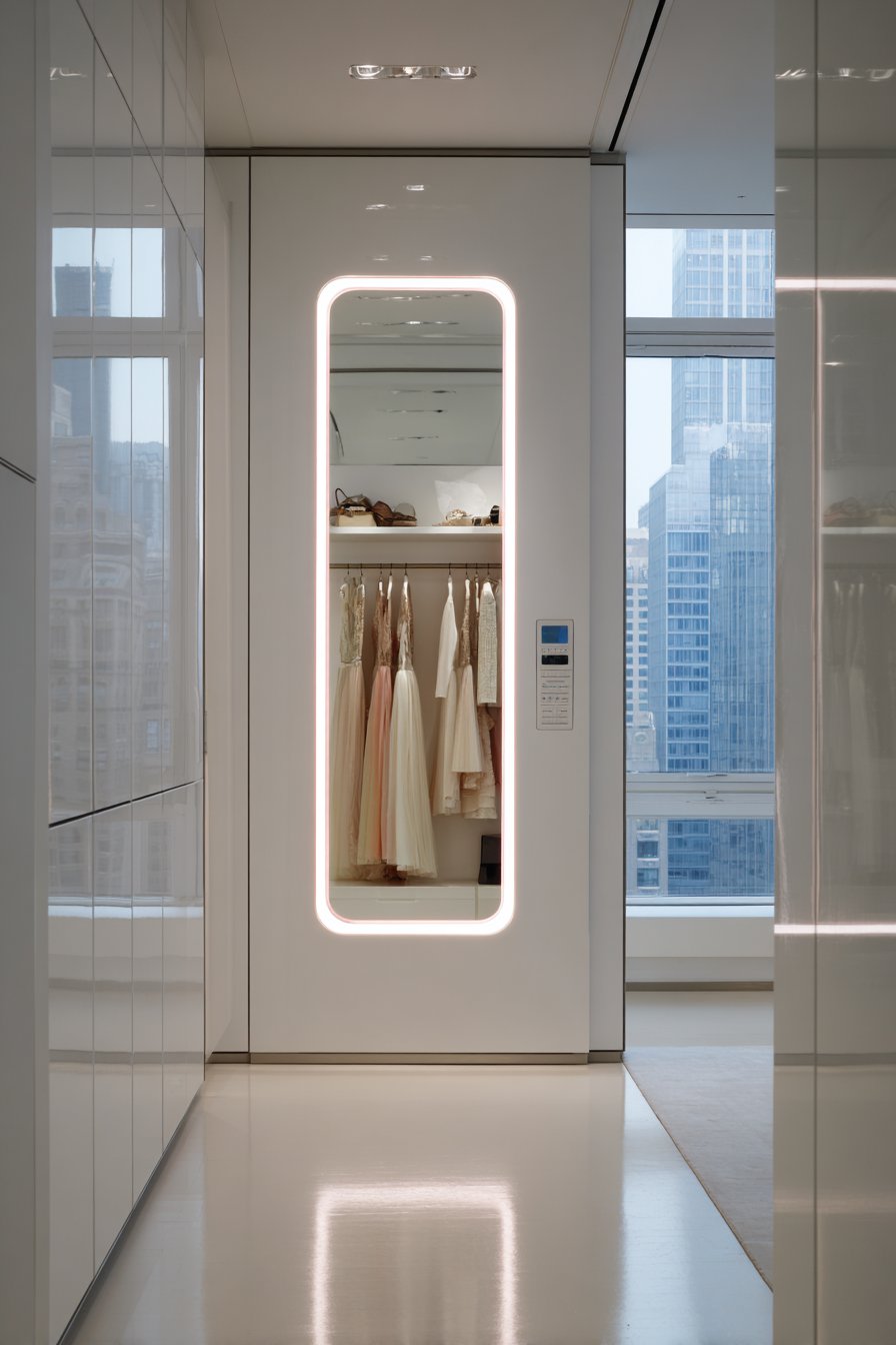 Balanced artificial lighting ensures clear visibility at all times, crucial for a mirror that serves practical dressing purposes alongside digital functionality. The lighting can likely be adjusted through voice commands or app controls, integrating with the broader smart home ecosystem.