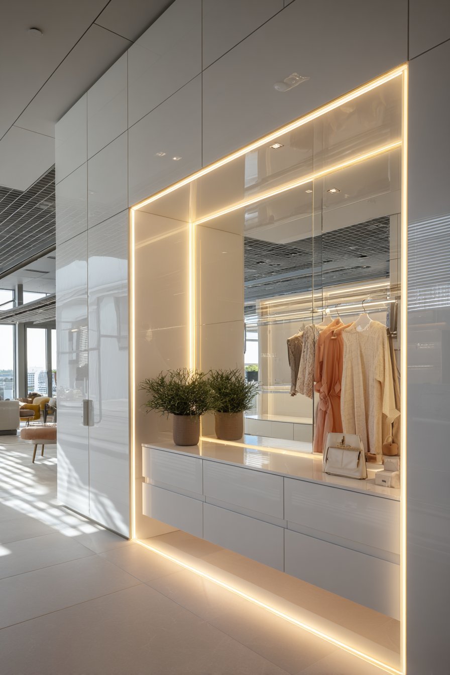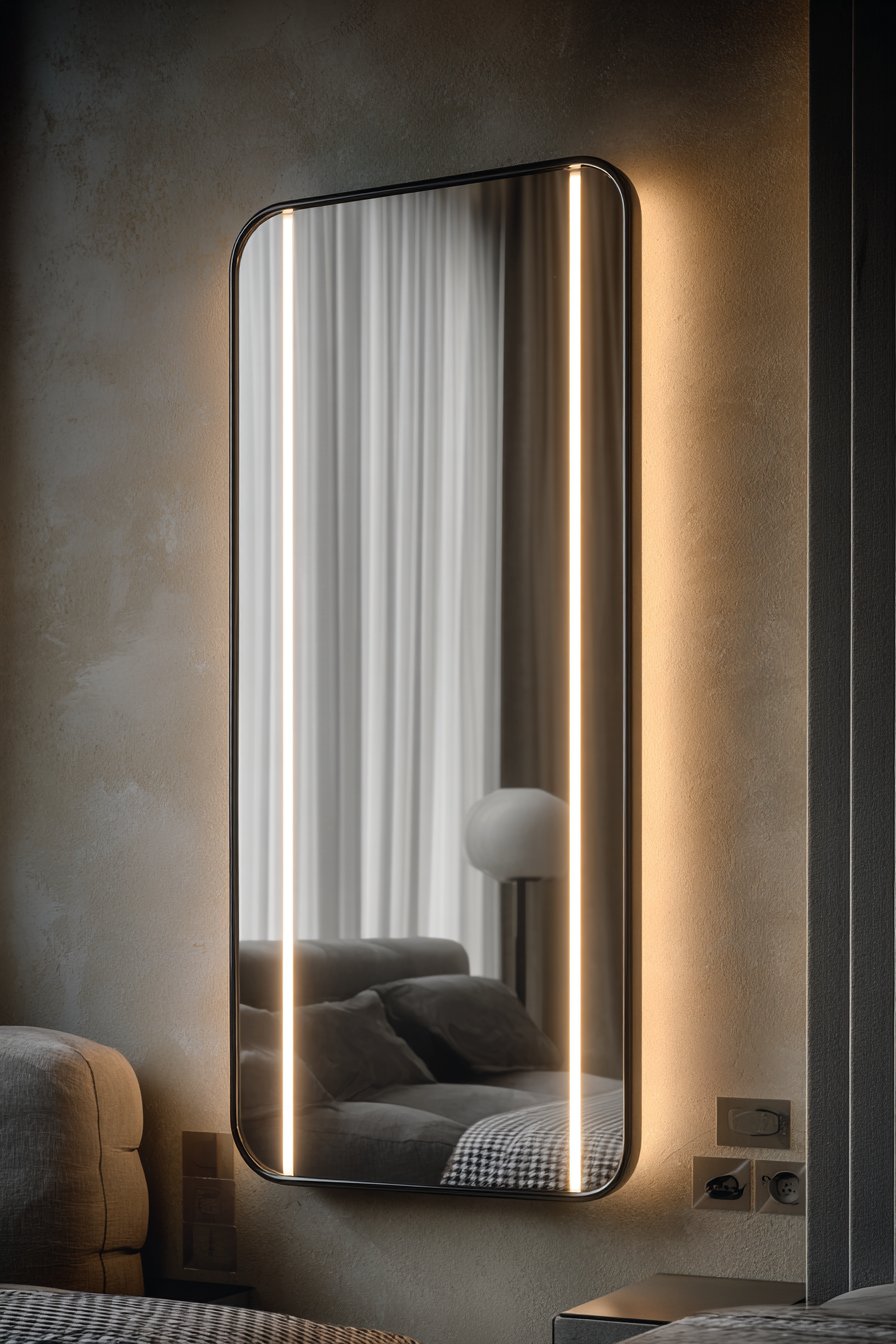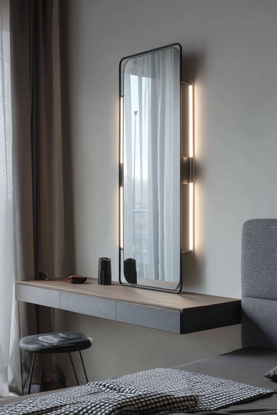 The modern bedroom dressing mirror idea featuring integrated LED lighting represents the perfect marriage of contemporary design and practical functionality. Picture a sleek rectangular mirror with a thin matte black metal frame mounted above a floating vanity console, its edges lined with soft LED strips that provide perfect, shadow-free illumination for grooming tasks. This design speaks to those who appreciate clean lines, modern materials, and technology-enhanced living.