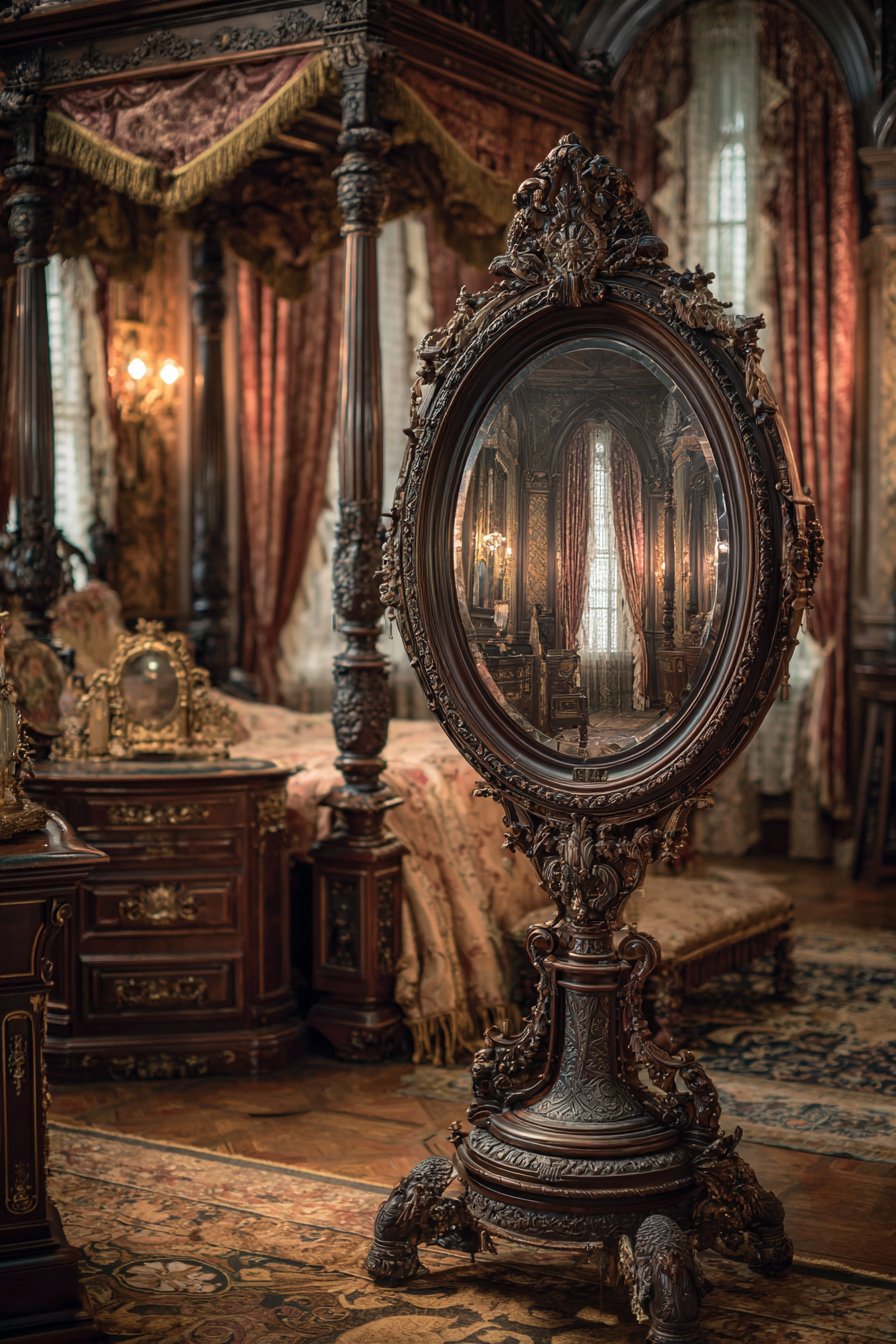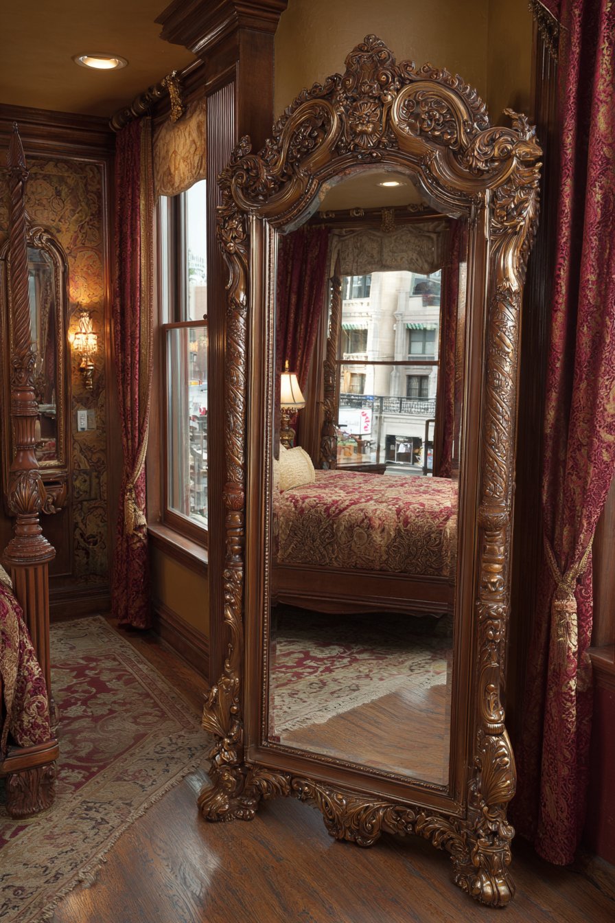 The ornate gold leaf frame catches and reflects light throughout the day, creating subtle shimmer that adds depth and dimension to the space. As the mirror reflects elegant bedroom furnishings—a sumptuous velvet headboard, gleaming brass table lamps, and carefully curated accessories—it essentially doubles the visual impact of these luxury elements, making the entire room feel more opulent and layered.