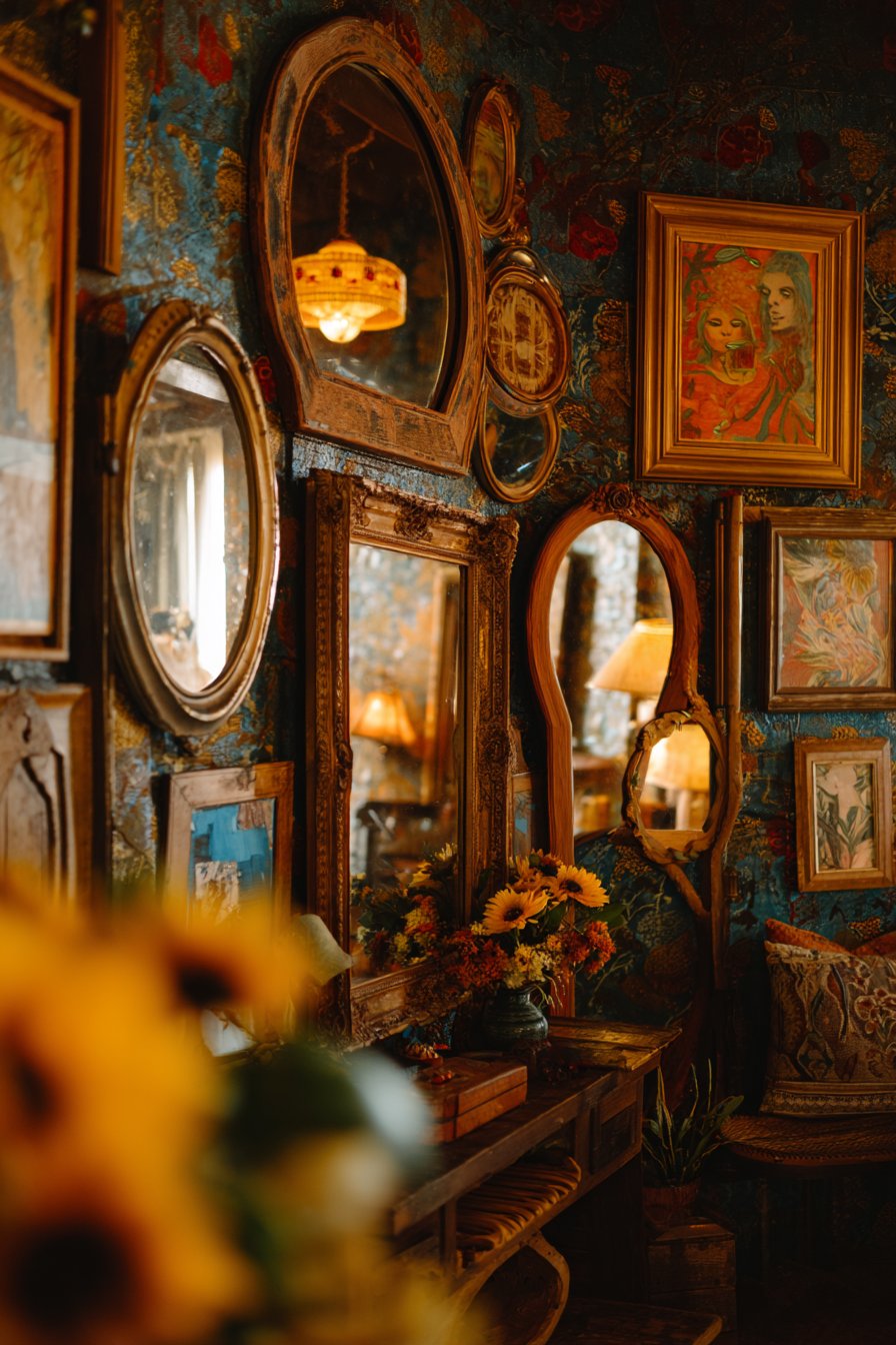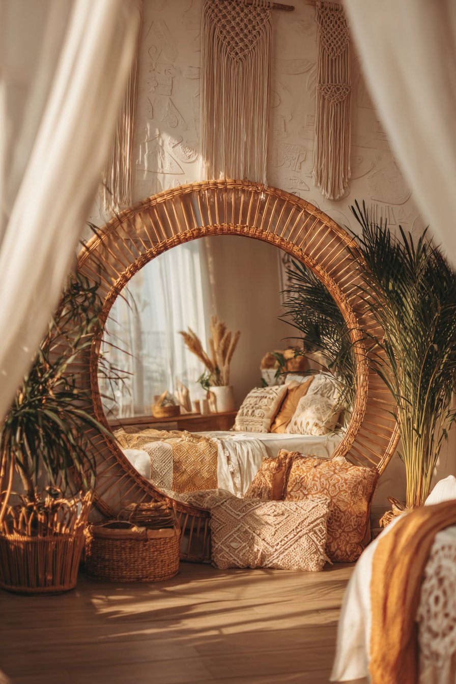 - Use macramé, tapestries, or woven wall hangings around the mirror