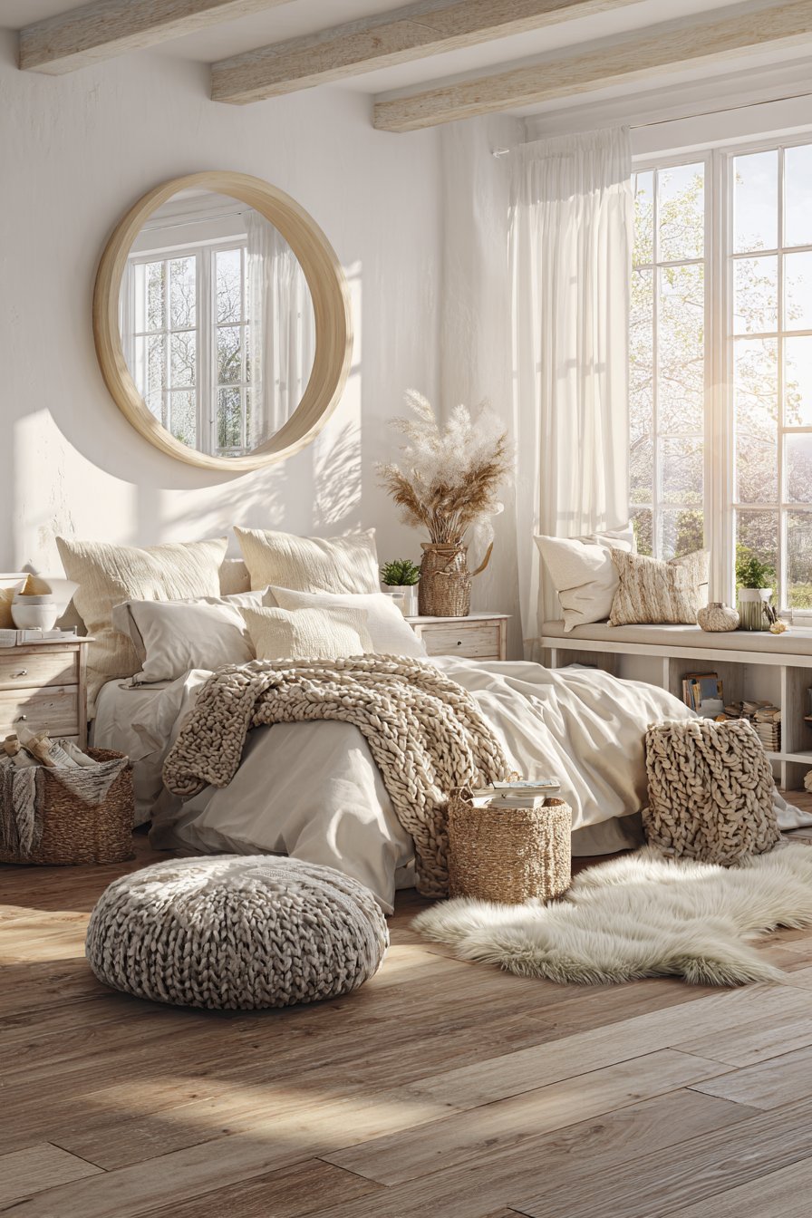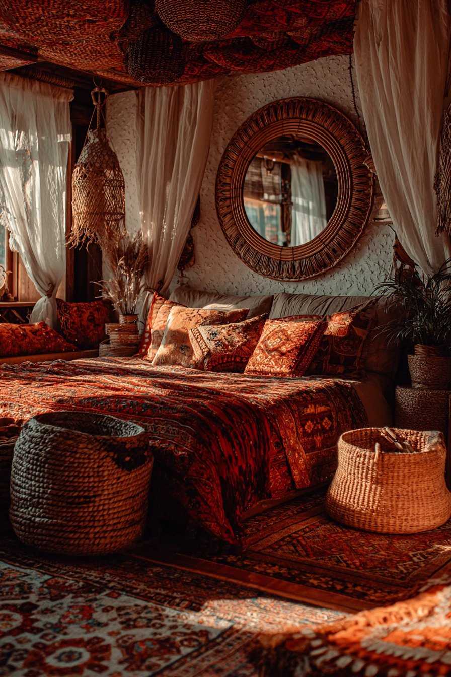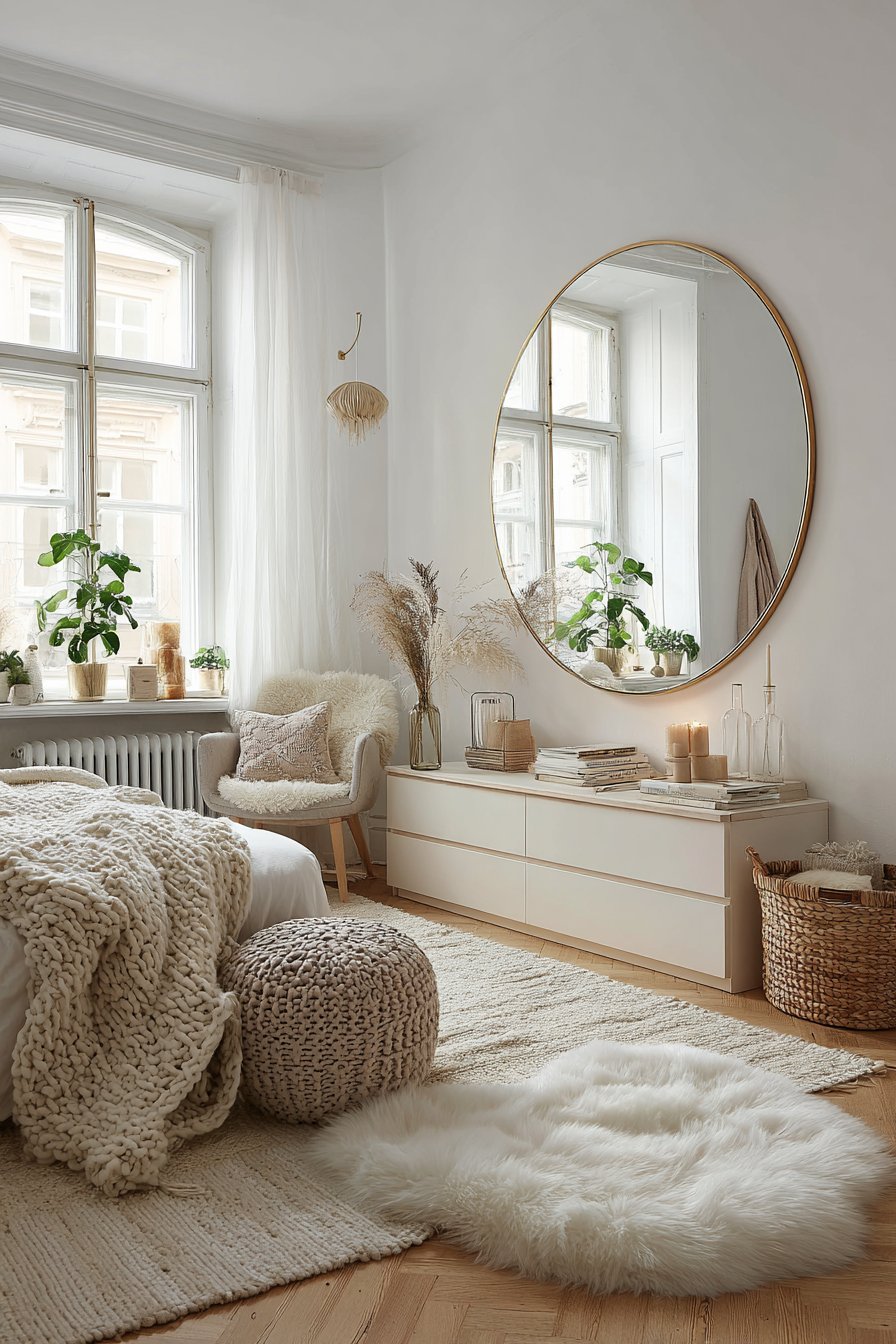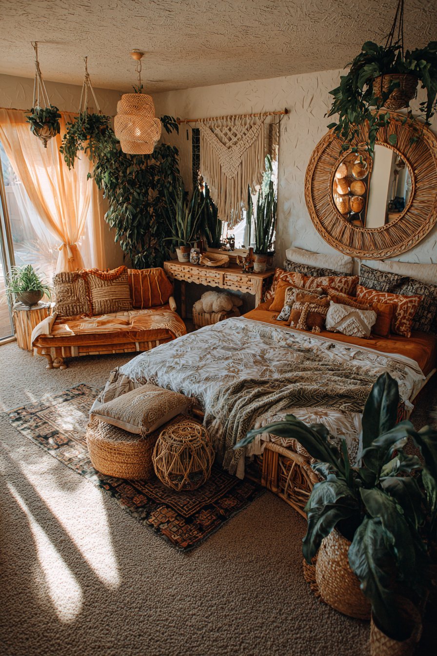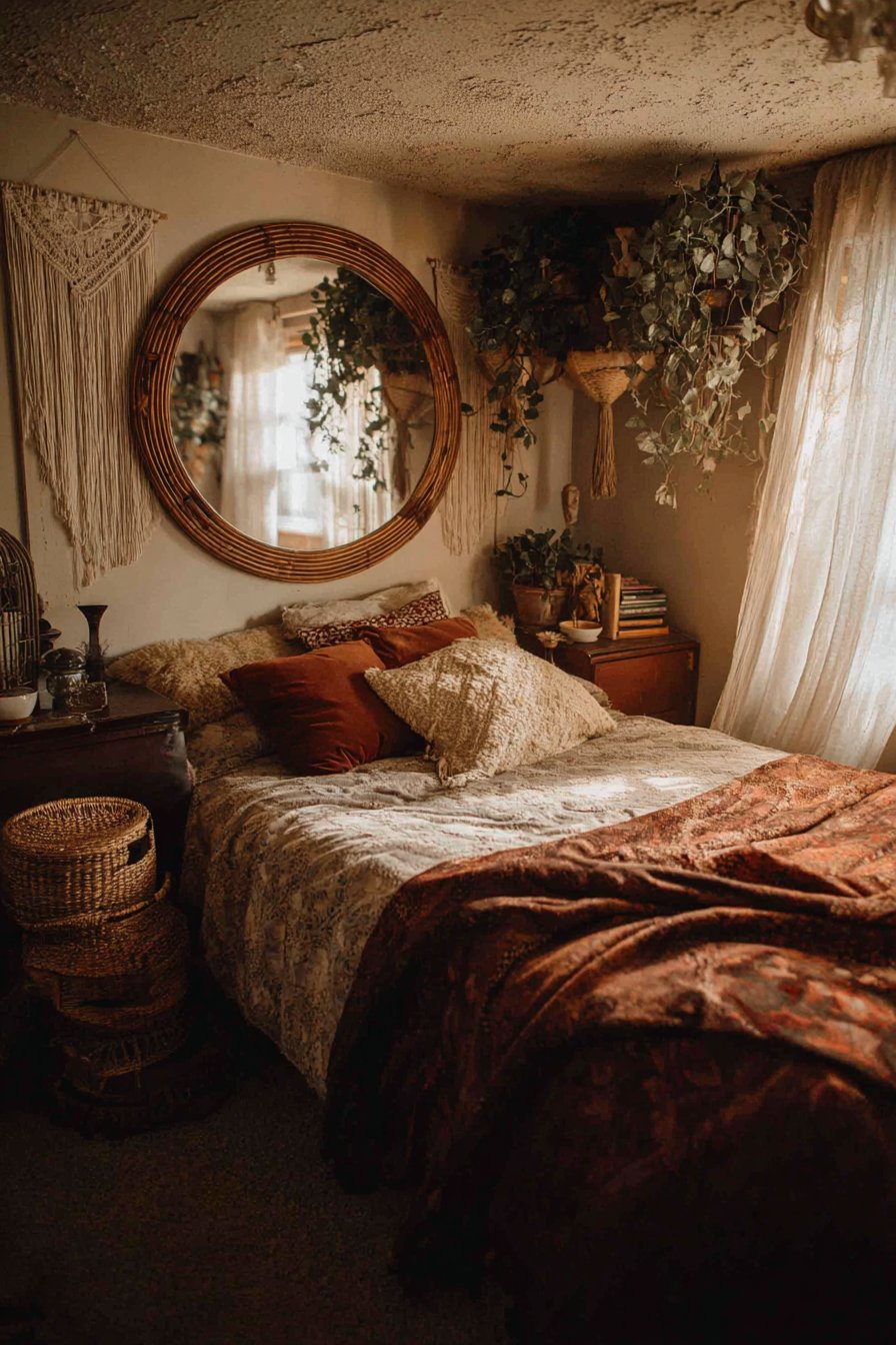 The bohemian bedroom dressing mirror idea celebrates free-spirited creativity and global influences through a large round rattan-framed mirror that becomes the centerpiece of an eclectic sanctuary. Hung on textured white walls adorned with macramé hangings, this mirror embodies the boho aesthetic’s love of natural materials, handcrafted details, and layered textures. The circular shape suggests harmony and flow, fitting perfectly within the bohemian philosophy of creating spaces that feel organic rather than rigidly structured.
