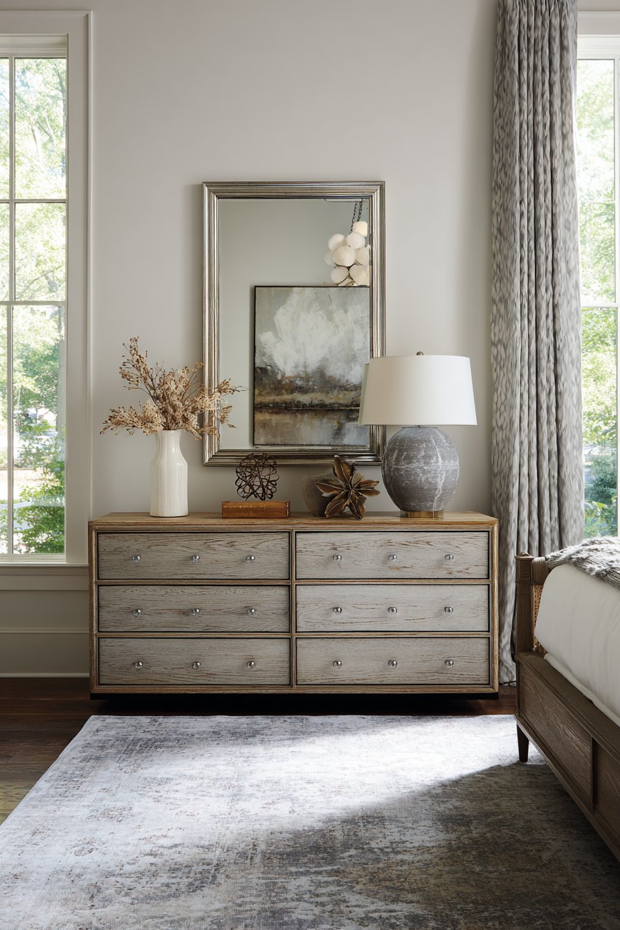 The decision to lean rather than hang this substantial mirror creates a more relaxed, approachable elegance. It suggests confidence in design choices while maintaining livability—this isn’t a museum but a lived-in space where beauty and comfort coexist. A plush area rug in complementary tones anchors the mirror, defining the dressing area as a distinct zone within the larger bedroom.