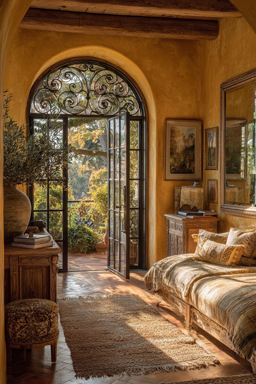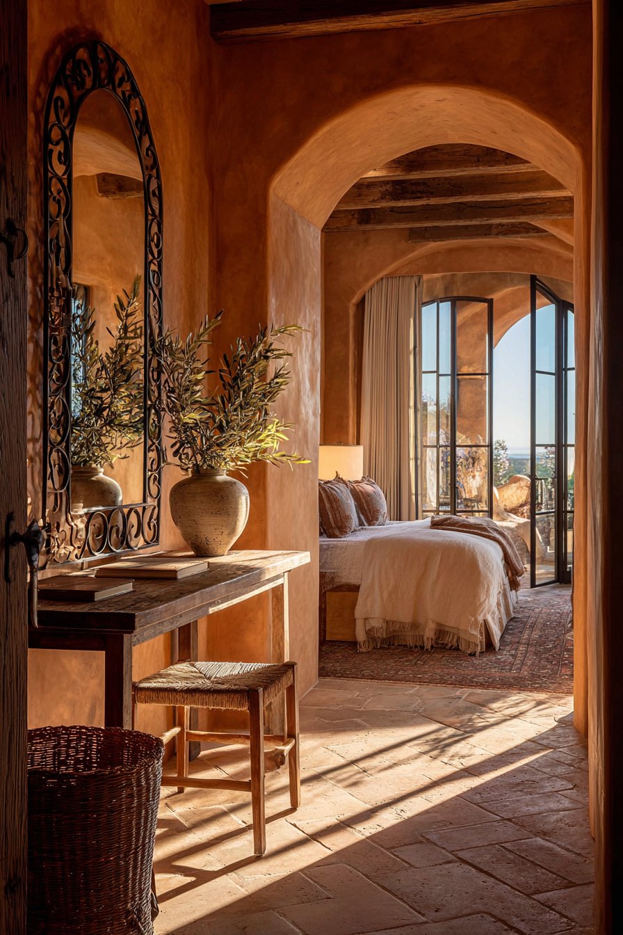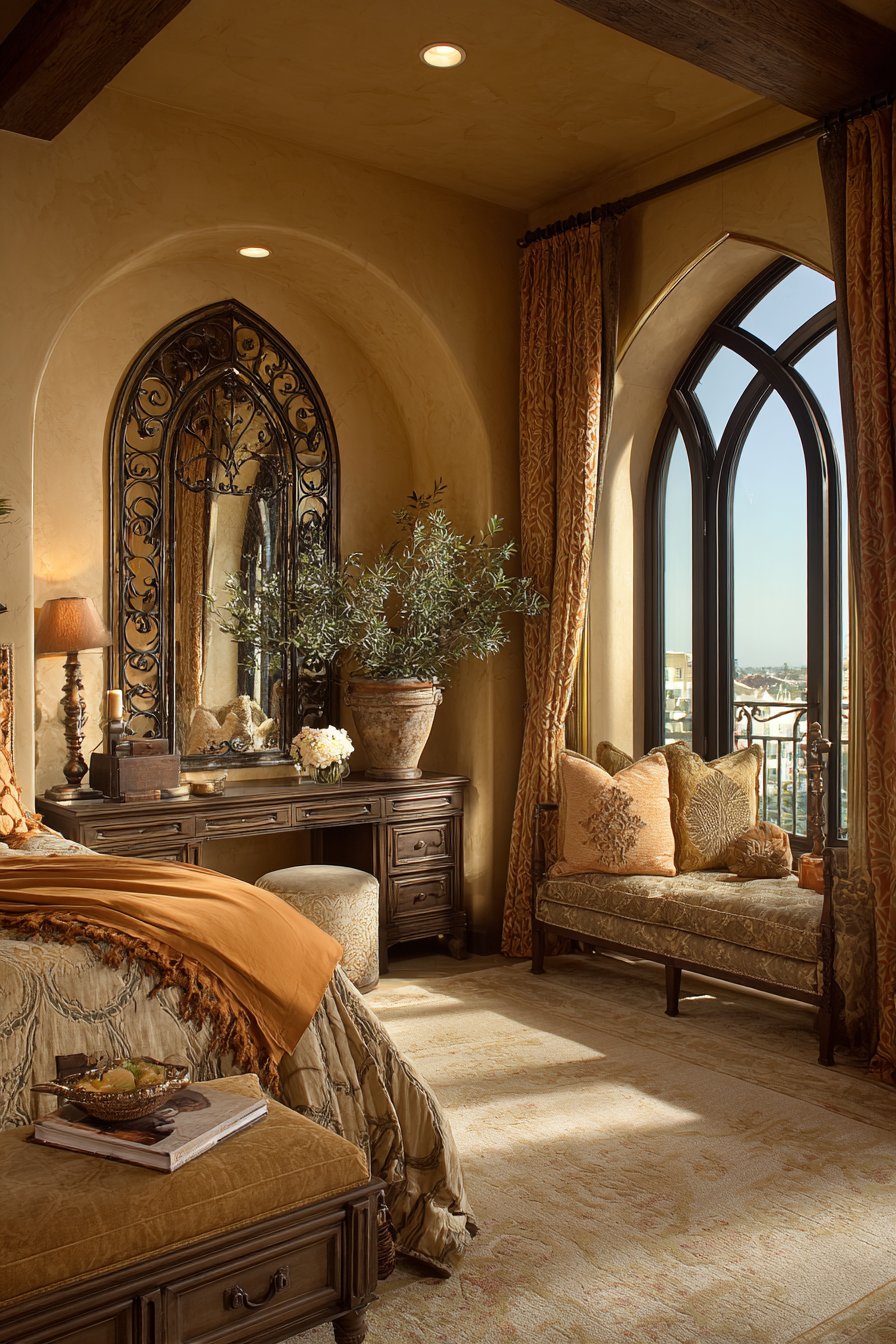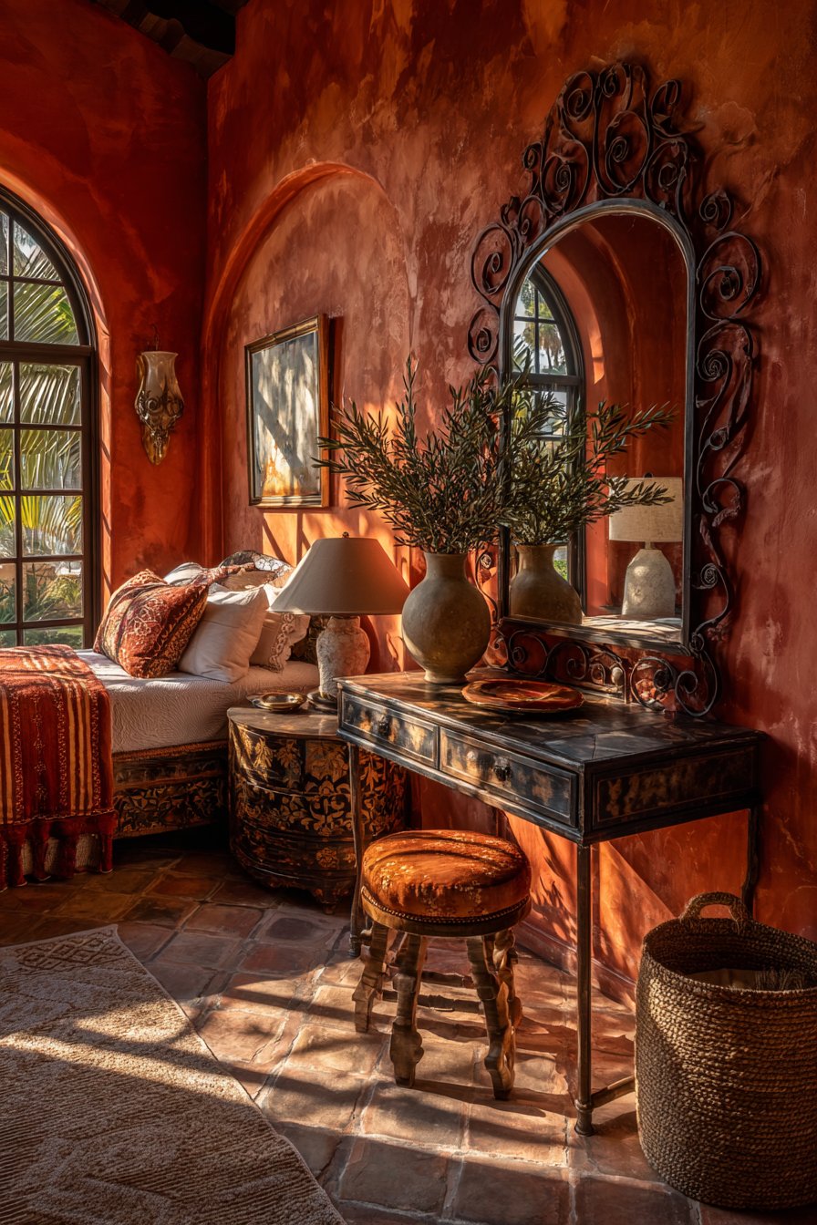 The Mediterranean bedroom dressing mirror idea transports you to coastal villas and sun-soaked terraces through an arched mirror featuring wrought iron scrollwork frame mounted on textured terracotta-colored walls. This design captures the warmth, romance, and Old World craftsmanship characteristic of Mediterranean regions—from the Spanish coast to the Italian countryside to Greek islands. The arched shape echoes architectural elements common throughout the Mediterranean: doorways, windows, colonnades, and courtyards that have defined the region’s aesthetic for centuries.