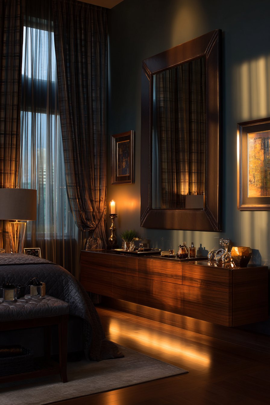 The sophisticated bedroom setting reinforces this refined masculine aesthetic through carefully chosen elements: charcoal bedding in high-quality fabrics that feel as good as they look; a leather headboard that develops beautiful patina with age; and tailored window treatments that control light while maintaining clean lines. This is not bachelor pad design but mature, confident masculinity that values quality, comfort, and timeless style.