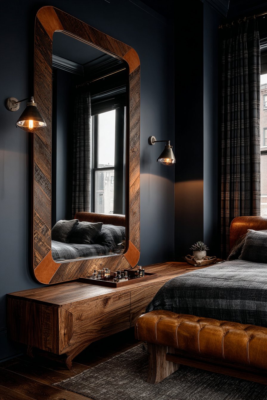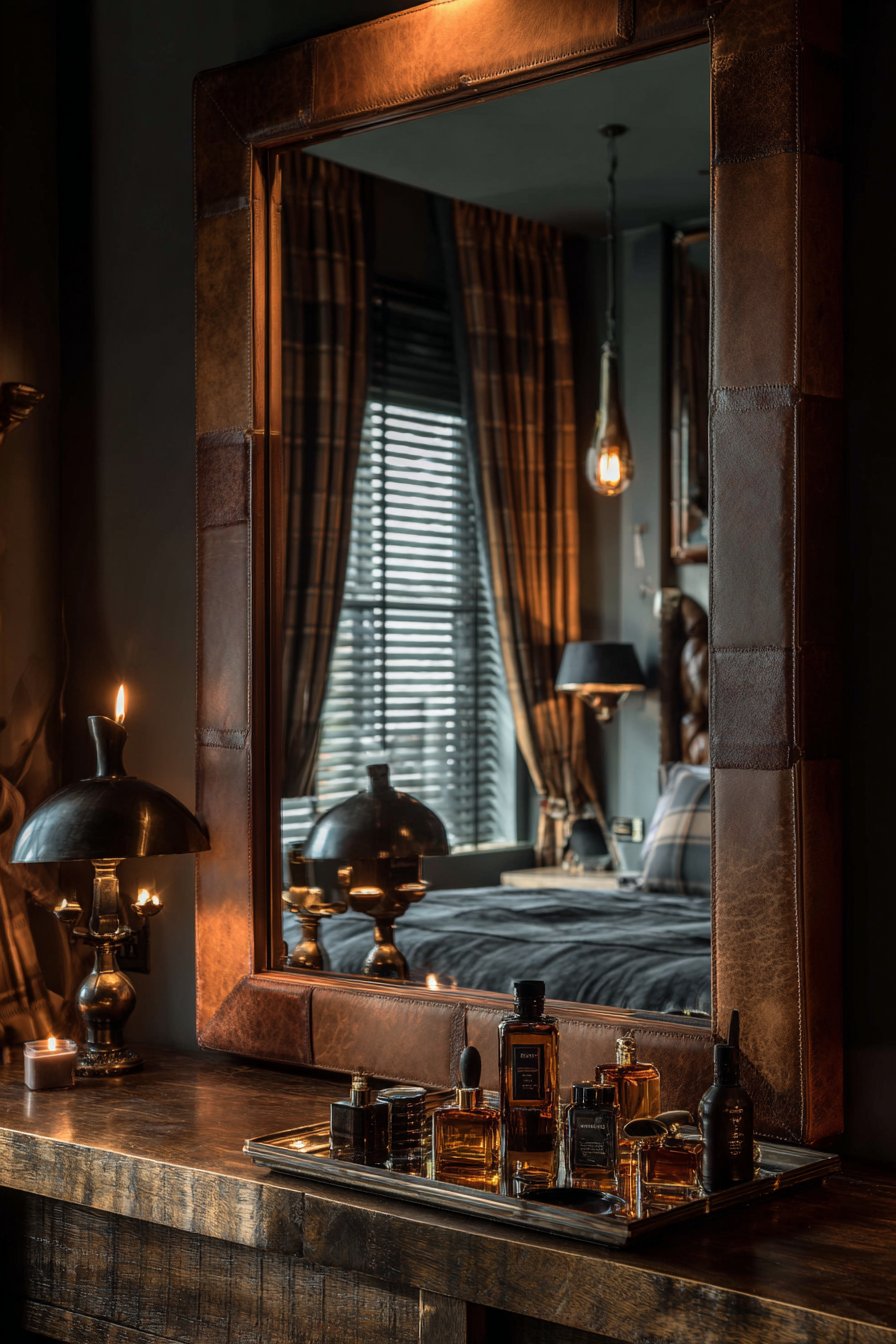 The masculine bedroom dressing mirror idea creates a sophisticated gentleman’s retreat through a substantial mirror with dark walnut wood frame and leather corner details mounted above a low credenza. This design speaks to those who appreciate quality materials, understated elegance, and spaces that feel refined without being fussy. The dark walnut provides rich, warm tones while the leather corner details add tactile luxury and subtle masculine edge—practical protection transformed into design detail.