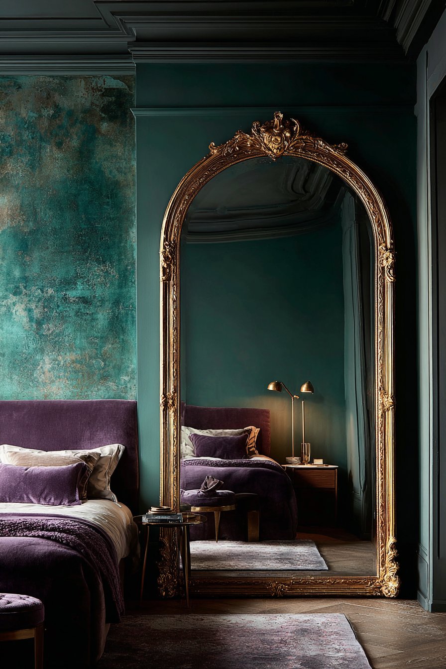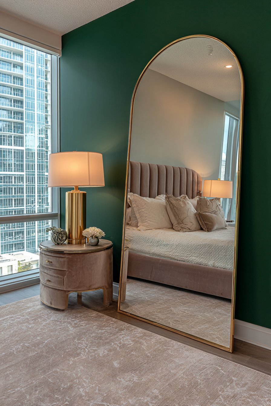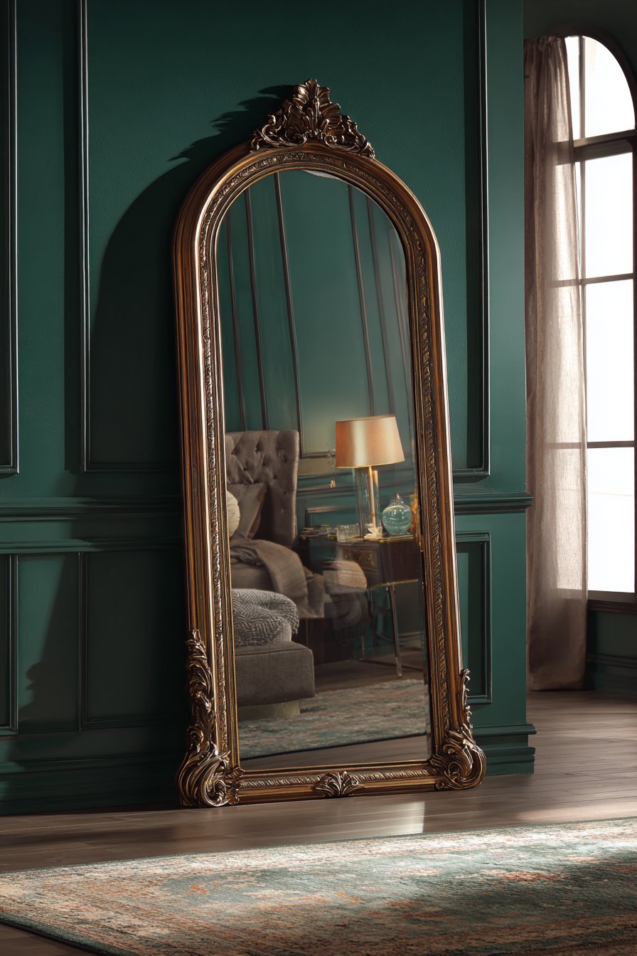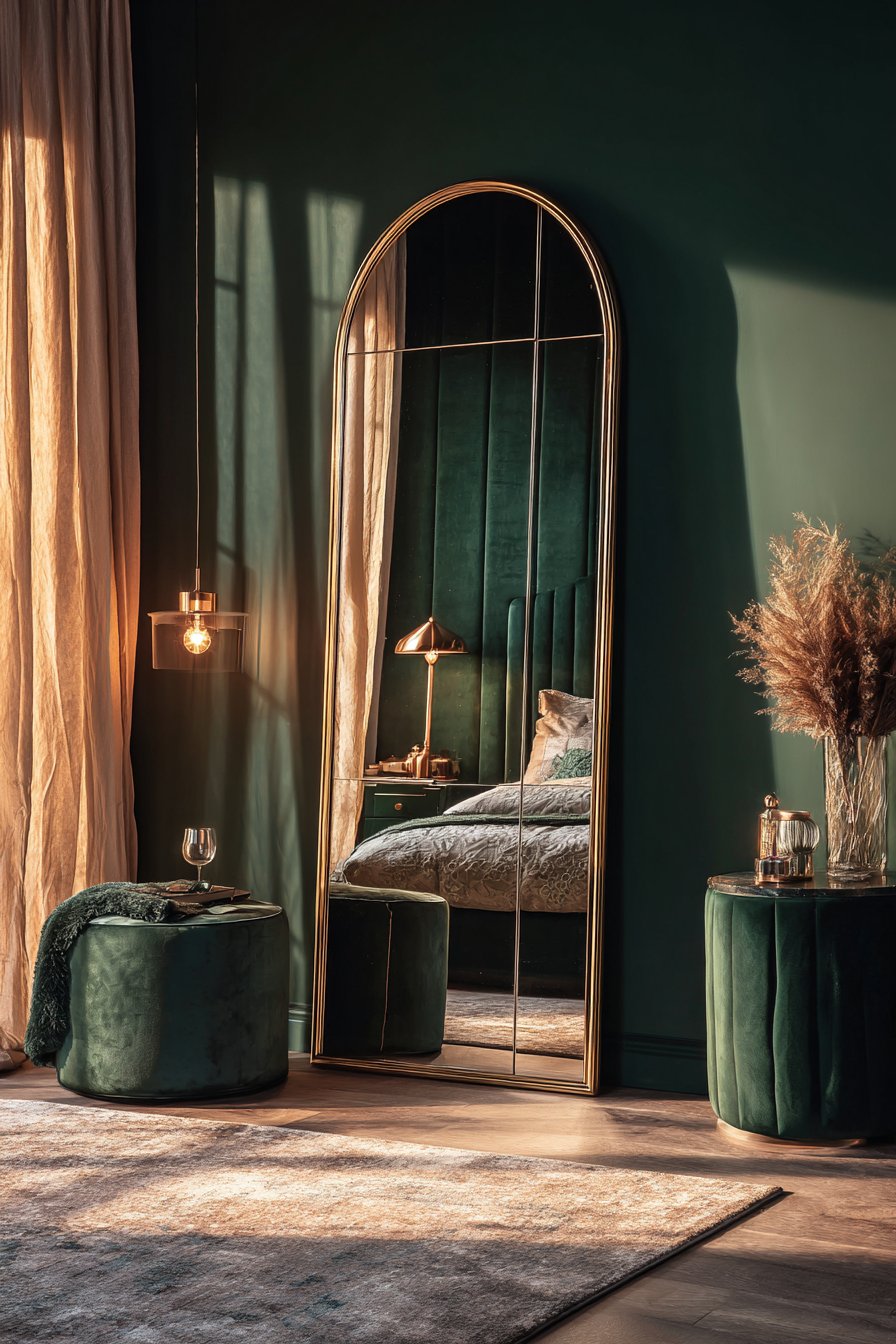 An oversized arched mirror with an antique gold leaf frame creates an instant statement of luxury and sophistication in the bedroom. This dressing mirror idea for bedroom design takes a bold approach, with the mirror leaning casually against a deep emerald green accent wall, creating a dramatic juxtaposition between the warm metallic tones and rich jewel-colored backdrop. The arch shape softens the overall look, preventing the large scale from feeling overwhelming while adding architectural interest.