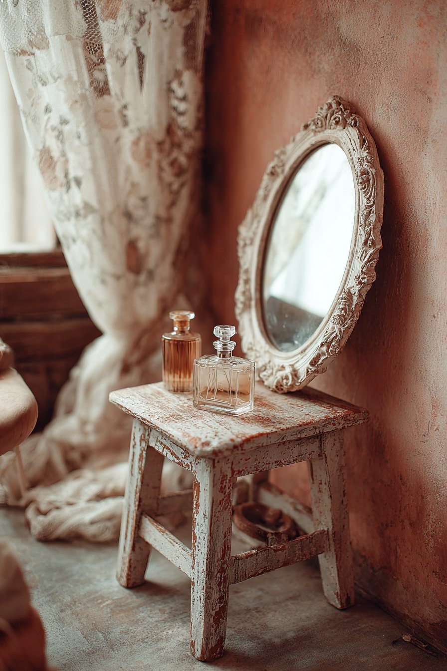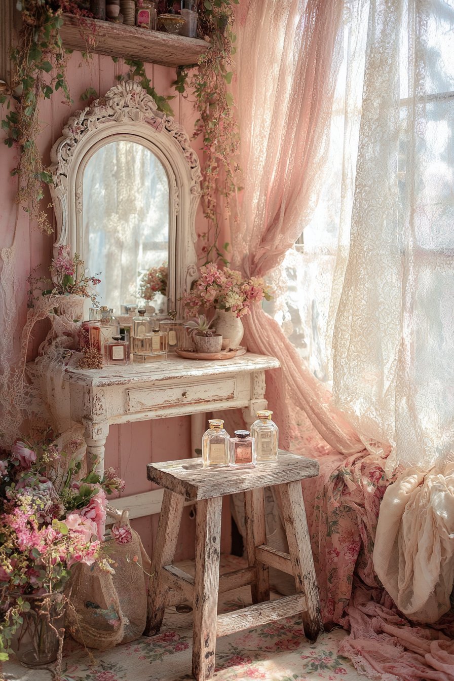Lace curtains—perhaps vintage or reproduction lace—filter gentle sunlight, creating soft, diffused illumination that flatters everything it touches. This quality of light is essential to shabby chic aesthetic, which avoids harsh contrasts in favor of gentle, romantic glow. A weathered wooden stool holds vintage perfume bottles with ornate stoppers, their jewel-toned glass catching and reflecting light.