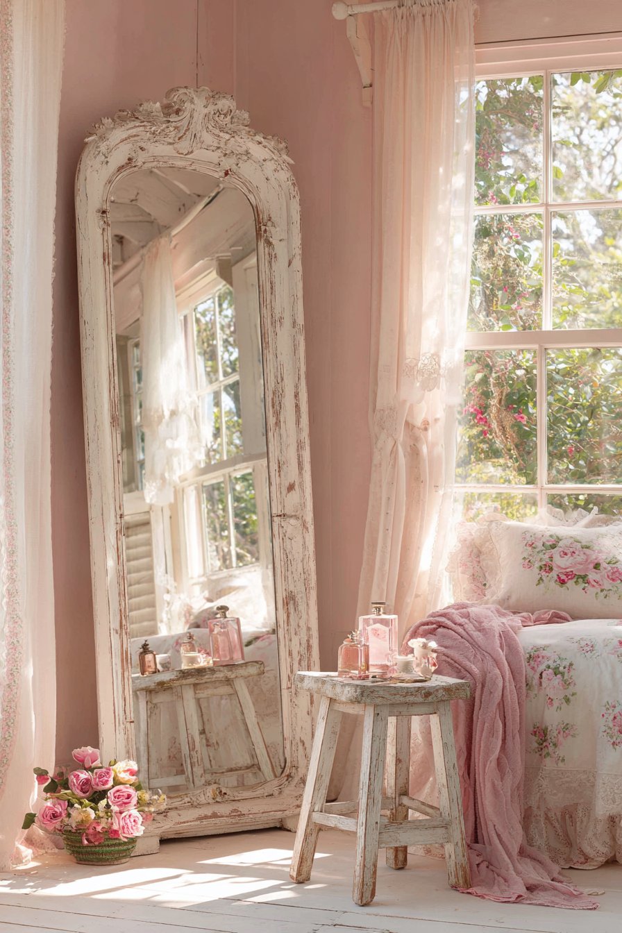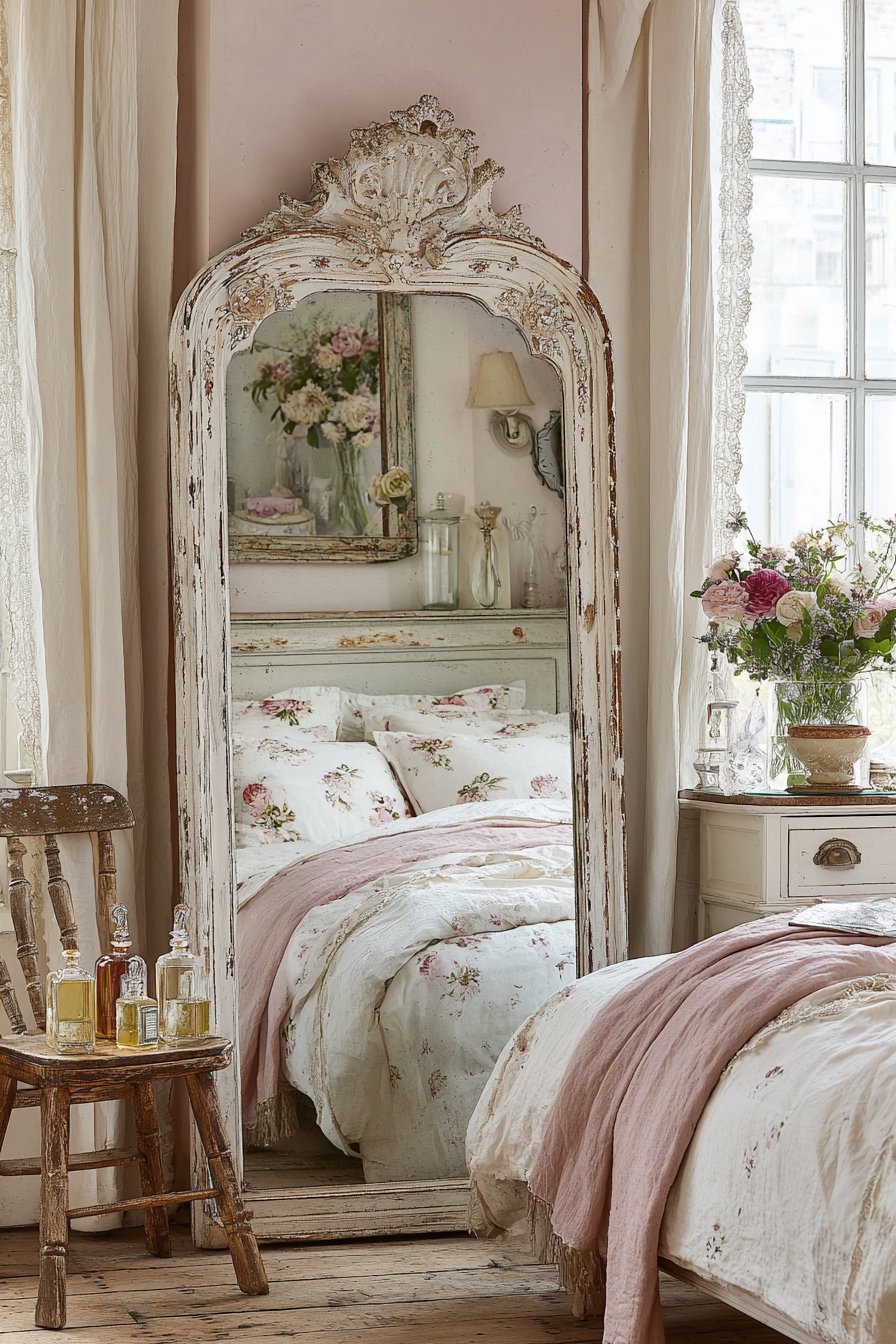 The shabby chic bedroom dressing mirror idea celebrates imperfection, history, and gentle femininity through a distressed white-painted mirror with ornate Victorian-style frame displaying intentional chipping and aged patina. This design philosophy finds beauty in wear and time, treating scratches, chips, and fading not as damage but as character—visible evidence of a piece’s journey through years of use and love. The ornate frame suggests Victorian origins or inspiration, but the deliberately distressed finish prevents it from feeling too precious or formal.
