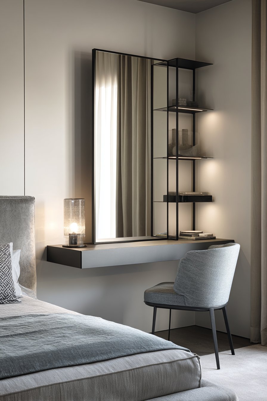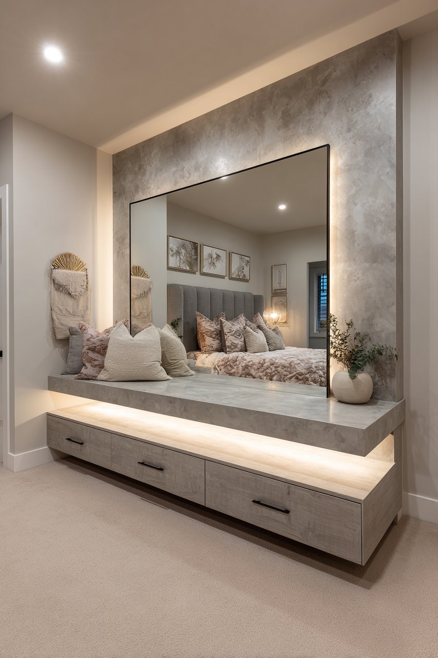 Against a backdrop of grey upholstered furniture and geometric bedding patterns, this dressing mirror idea for bedroom spaces demonstrates how modern design can feel both sophisticated and approachable. The neutral palette allows the mirror’s architectural qualities to shine while creating a cohesive, restful environment that doesn’t sacrifice style for serenity.